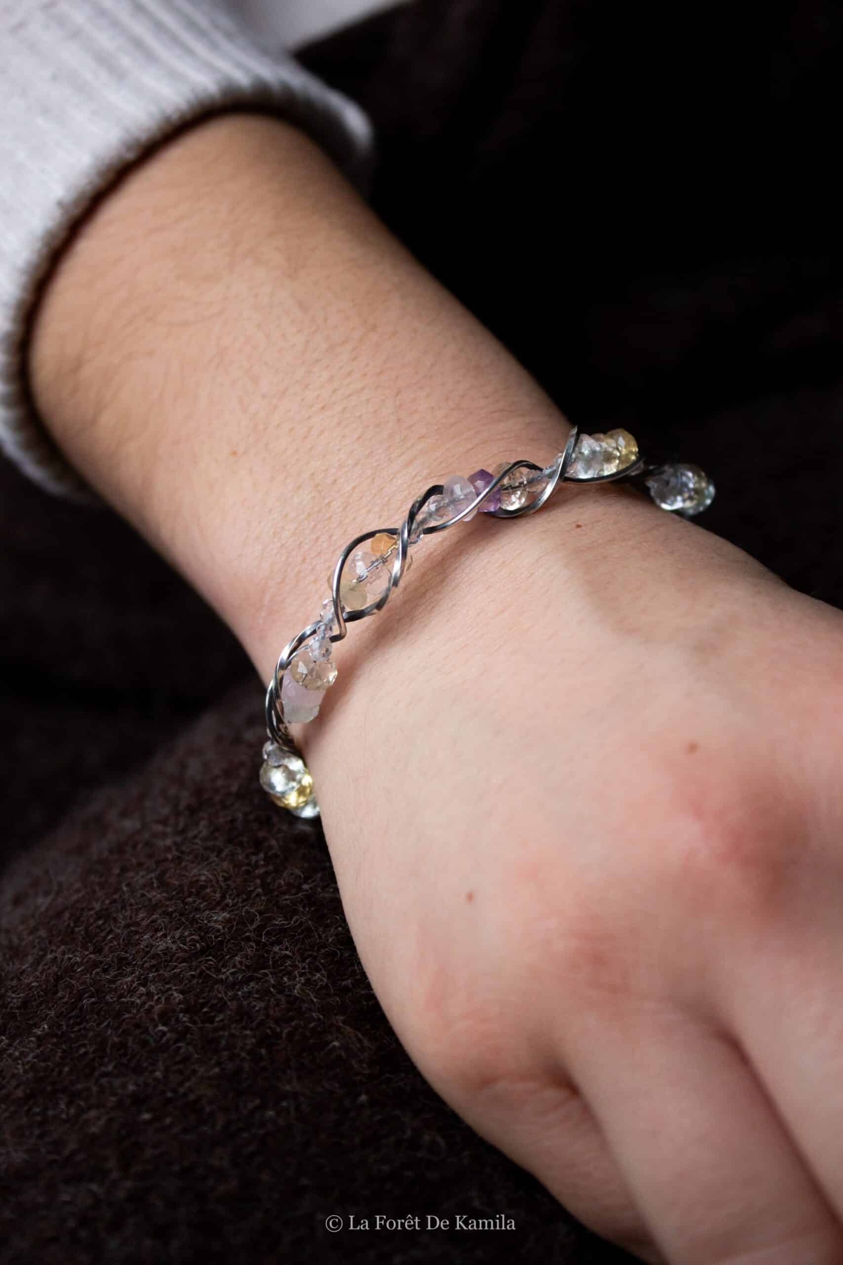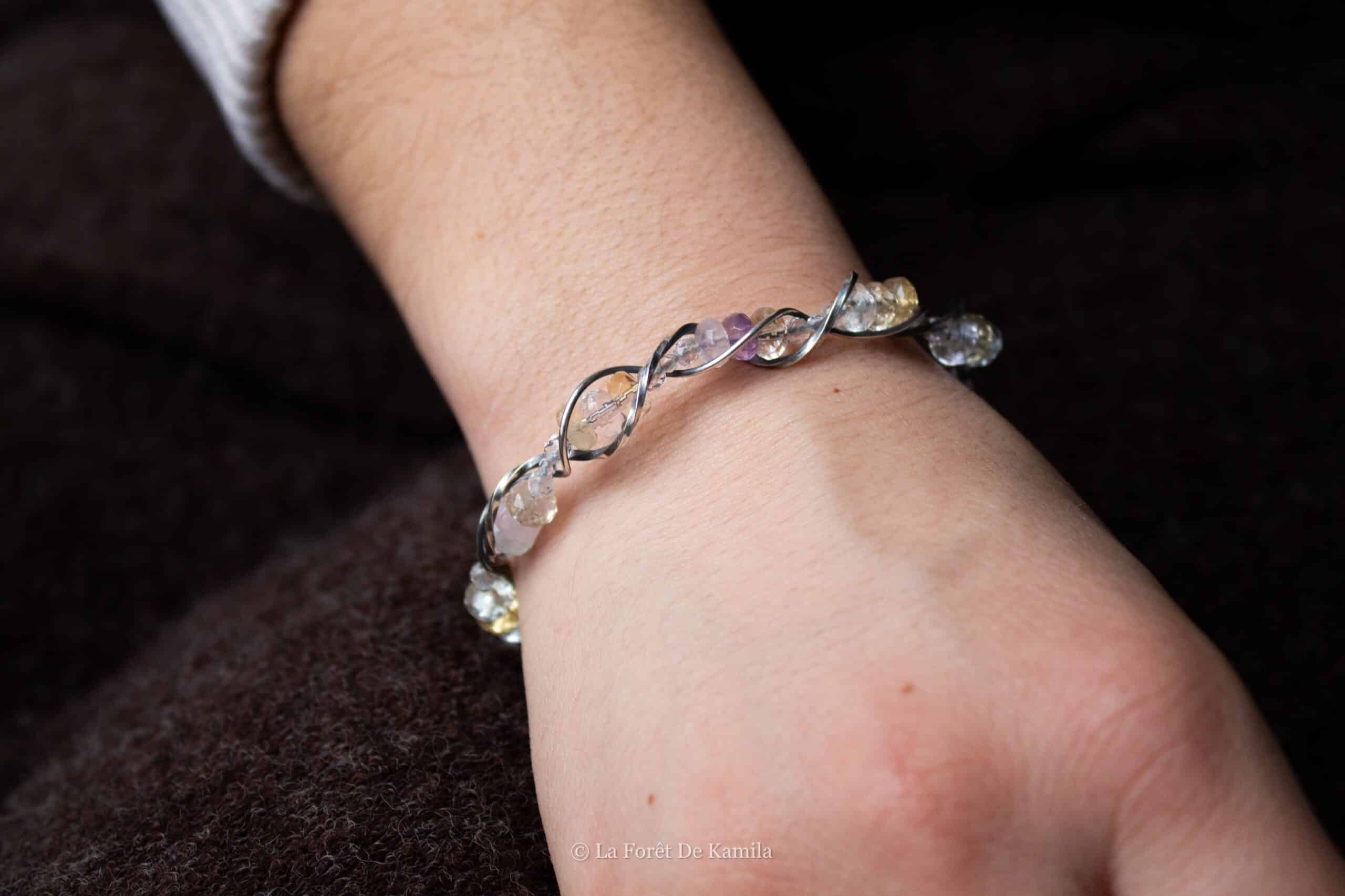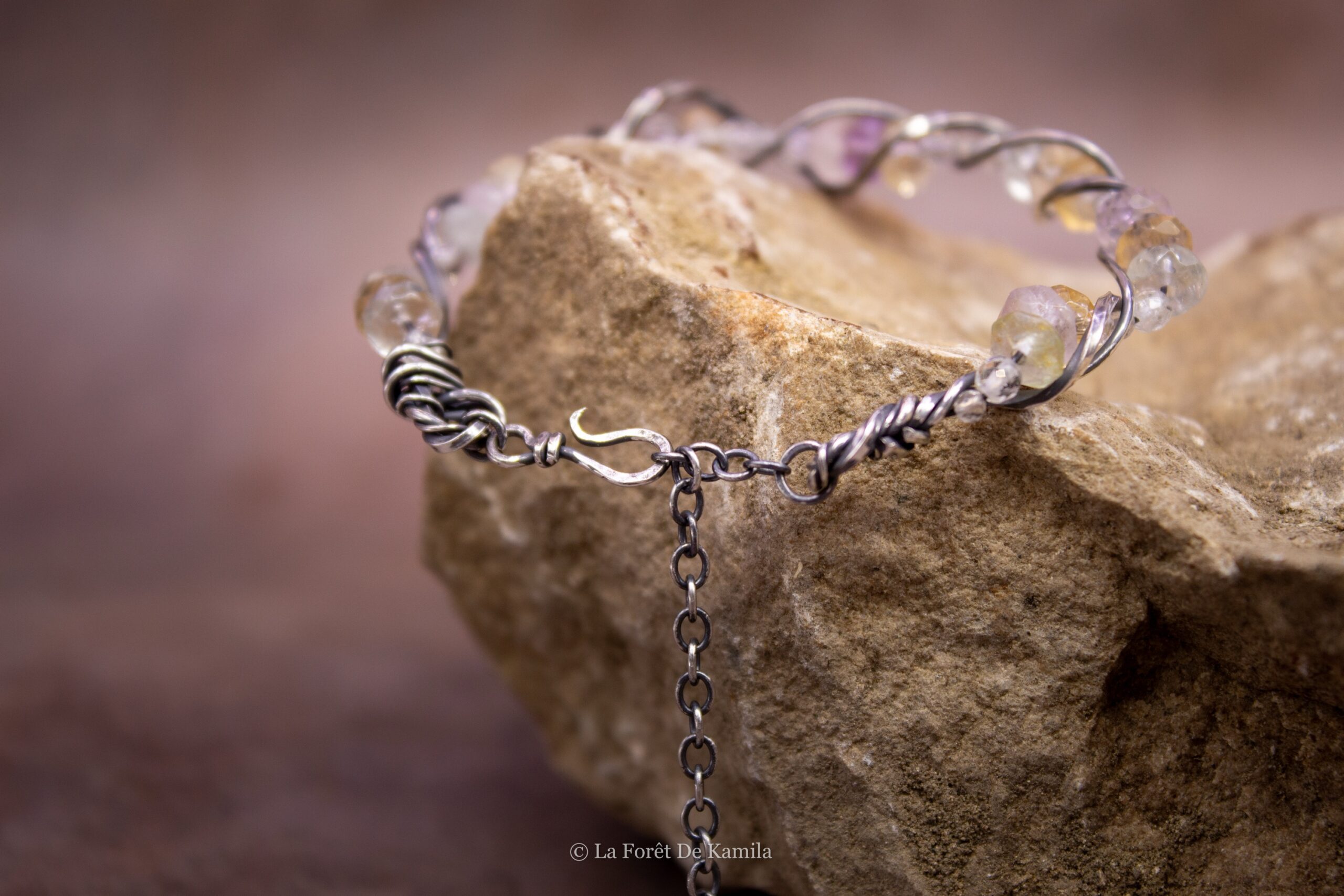 L’amétrine, fusion naturelle d’améthyste et de citrine, symbolise l’équilibre entre calme et vitalité, tandis que le cristal de roche en amplifie la clarté. Une chaînette d’extension vient terminer le bracelet pour qu’il s’ajuste parfaitement à votre poignet.