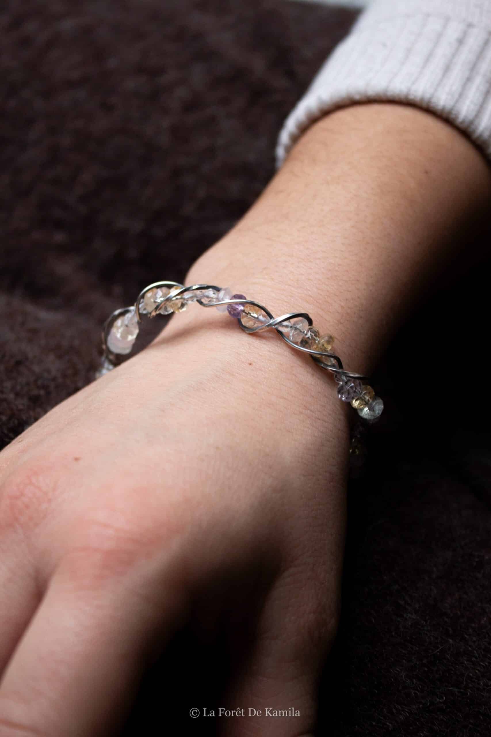 Alliance de clarté et de douceur, ce bracelet réunit les tons violets de l’amétrine et la transparence du cristal de roche, tressés à la main sur des fils d’argent oxydé. Le contraste entre la lumière des pierres et la patine du métal crée une harmonie subtile, à la fois délicate et contemporaine.