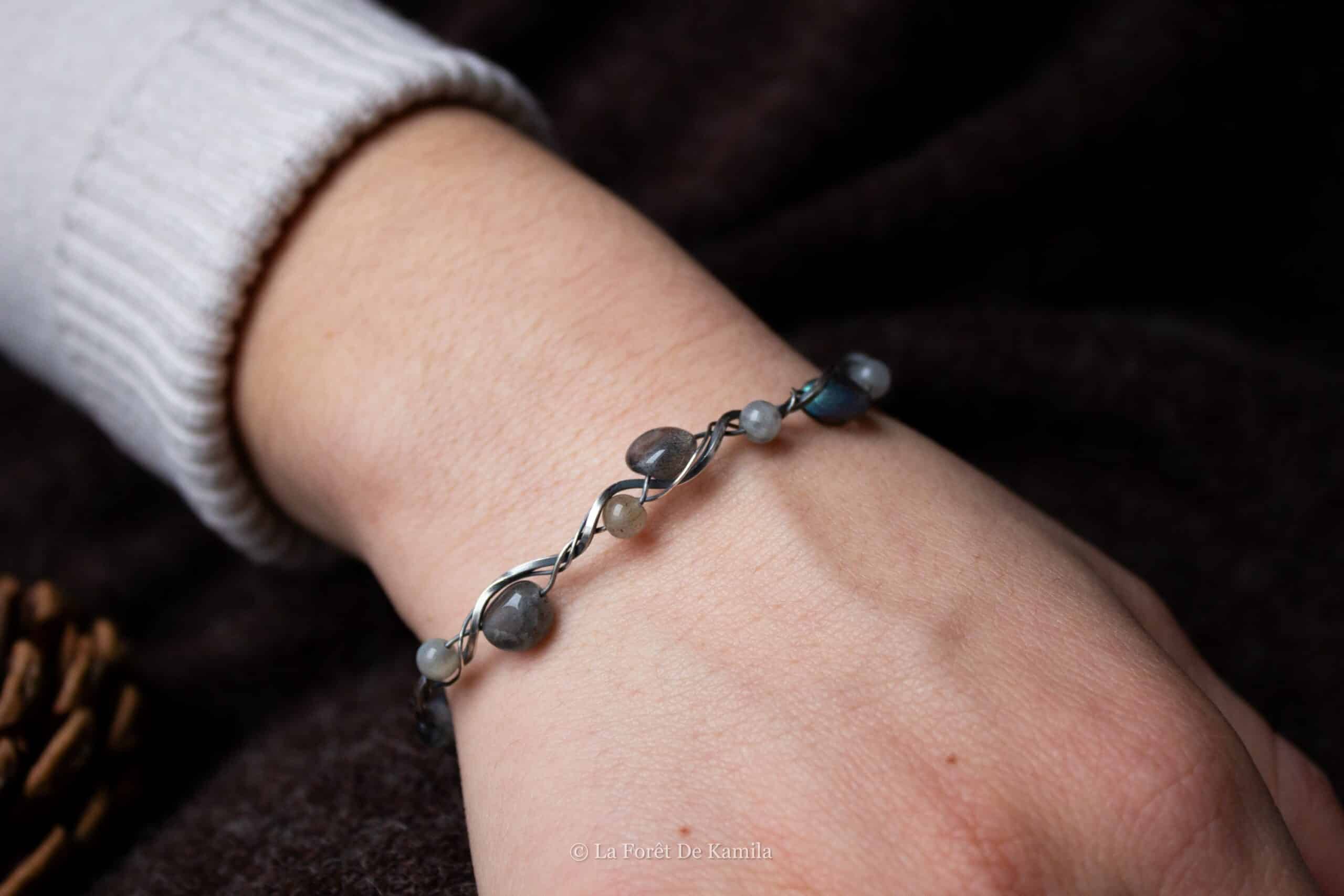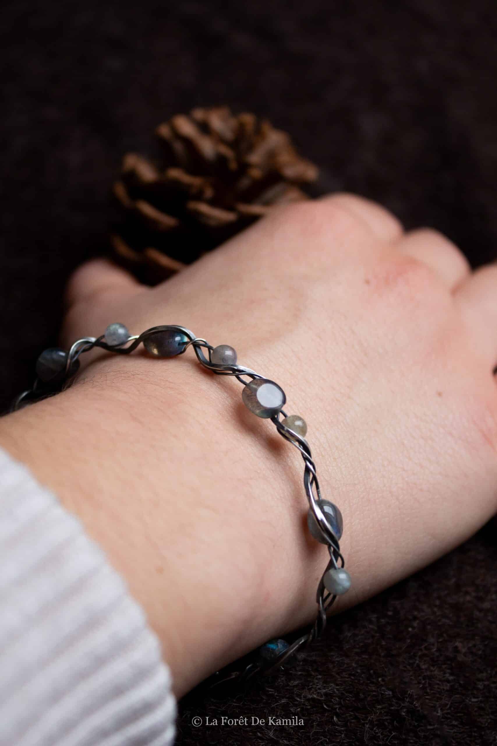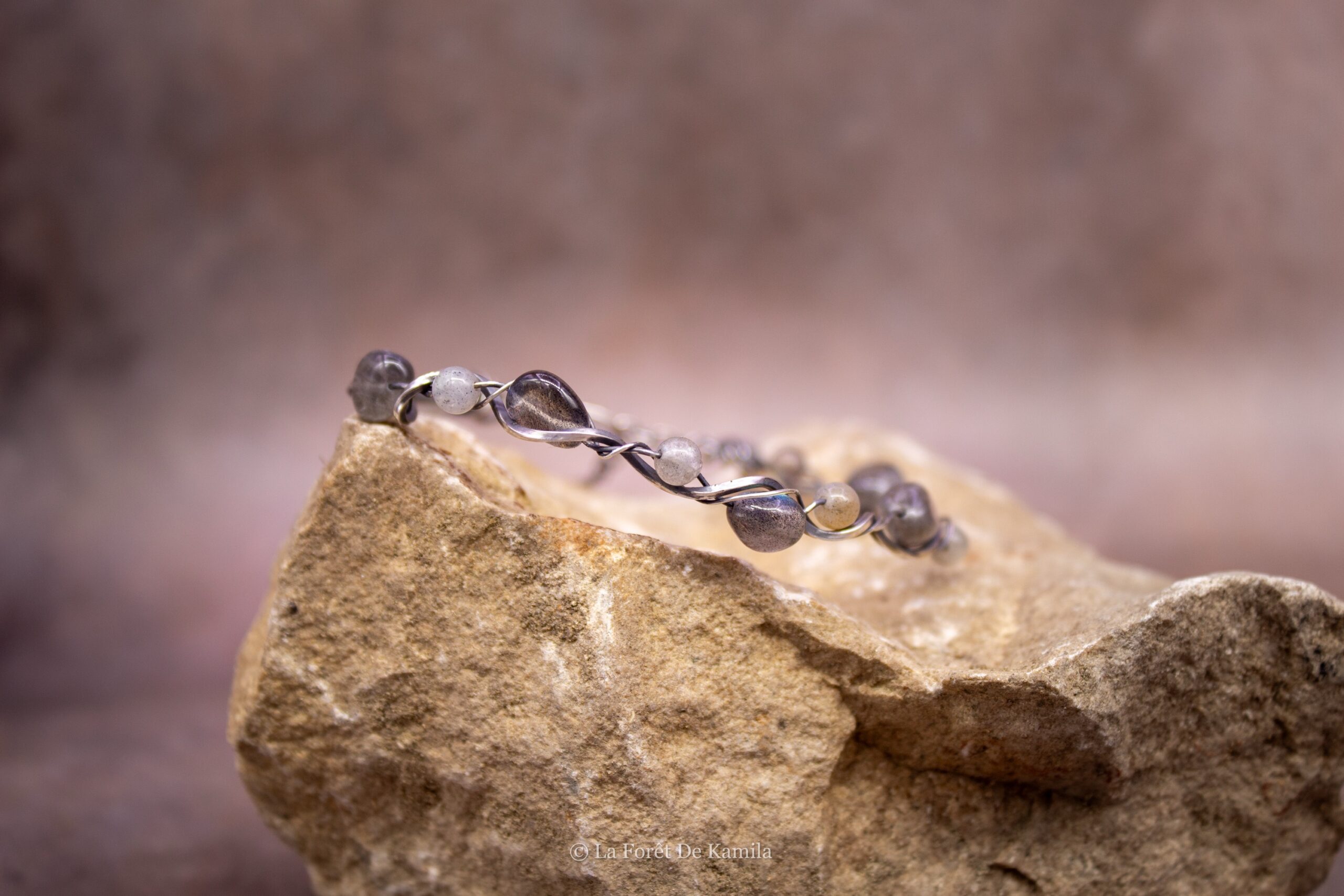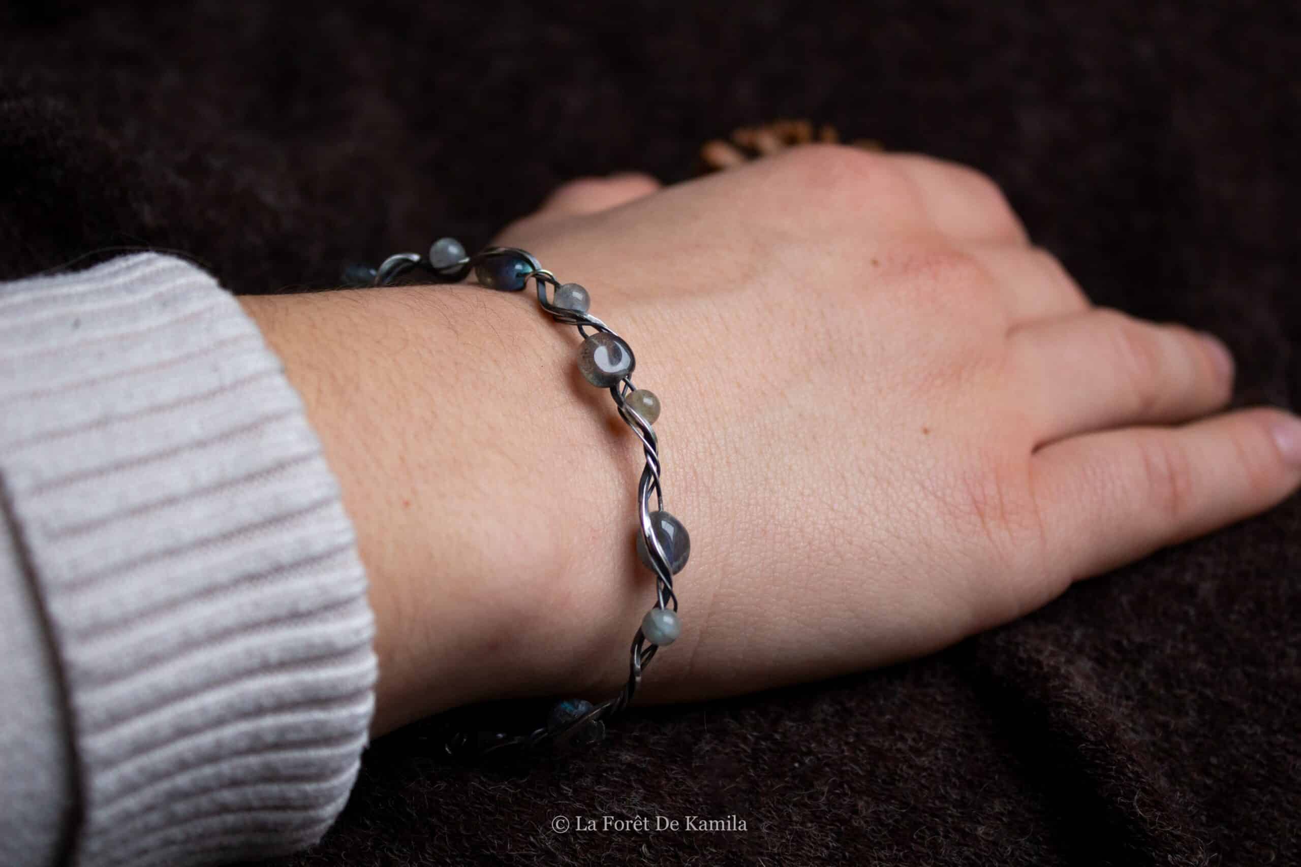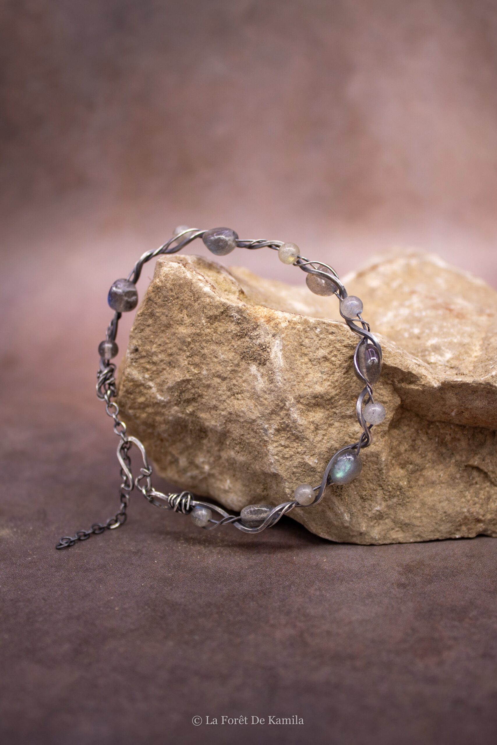 Ce bracelet joue avec la lumière : les reflets changeants de la labradorite se mêlent à la teinte sombre de l’argent oxydé. Chaque perle dévoile des éclats bleus, verts ou dorés selon l’angle, tandis que le tressage et les torsades de fils d’argent de tailles variées ajoutent relief et élégance.