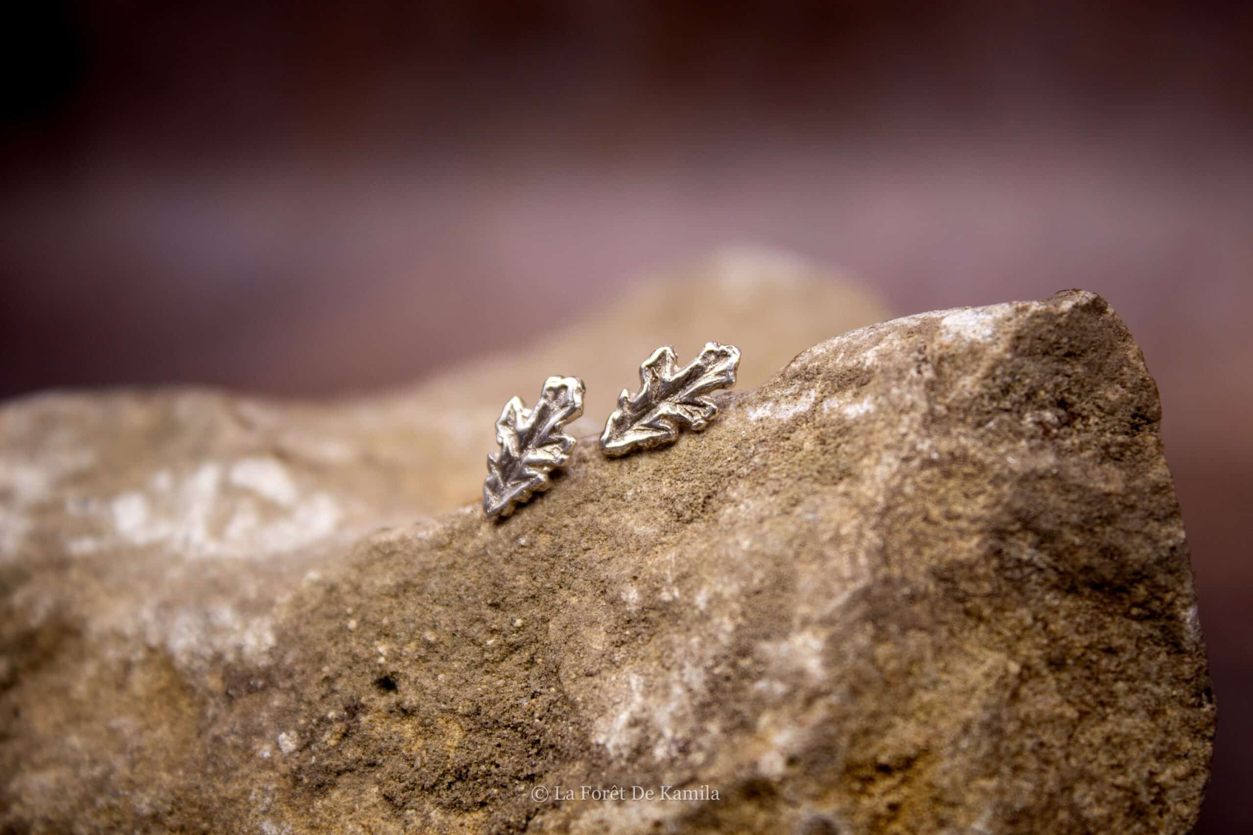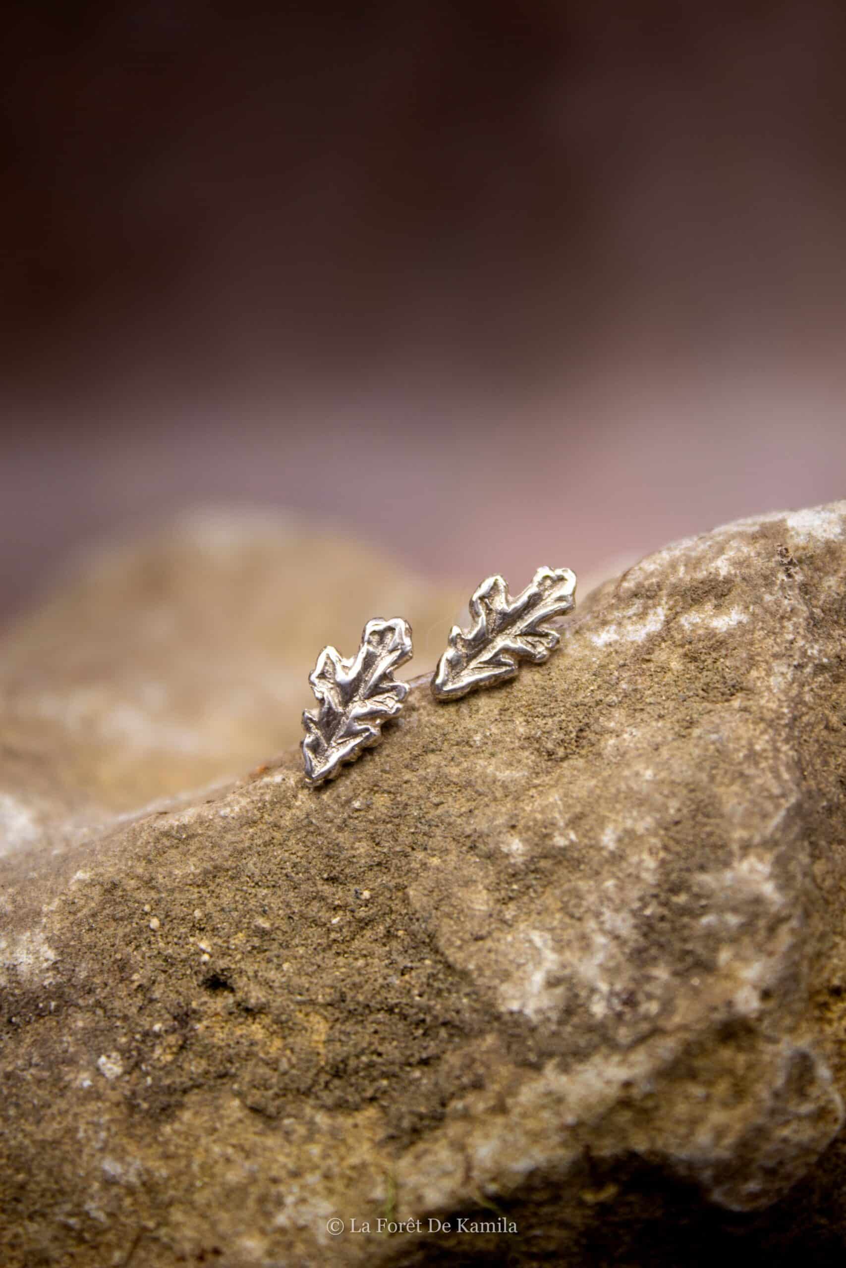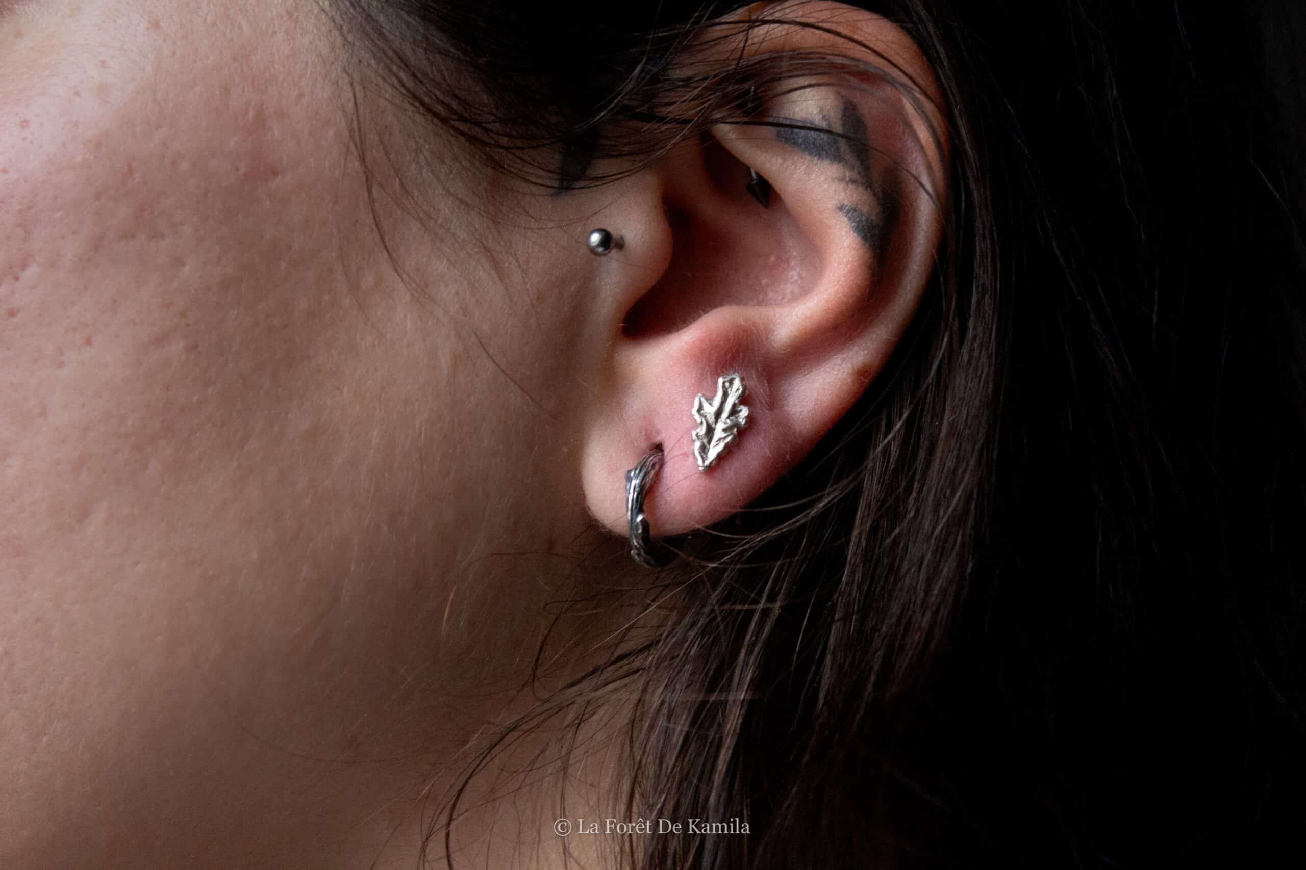 Ce clou d’oreille est une petite sculpture en argent massif, représentant une feuille de chêne gravée à la main. L’argent a été oxydé pour mettre en valeur les nervures et la profondeur du travail.