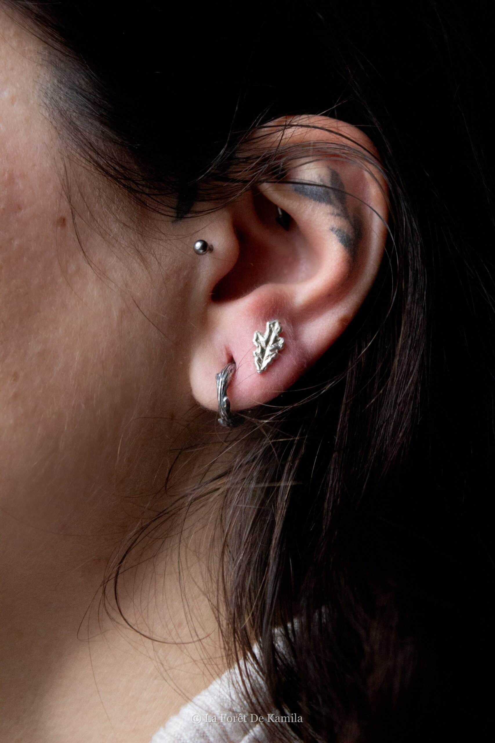 Clou d’oreille en argent massif 925, gravé à la main en forme de feuille de chêne.