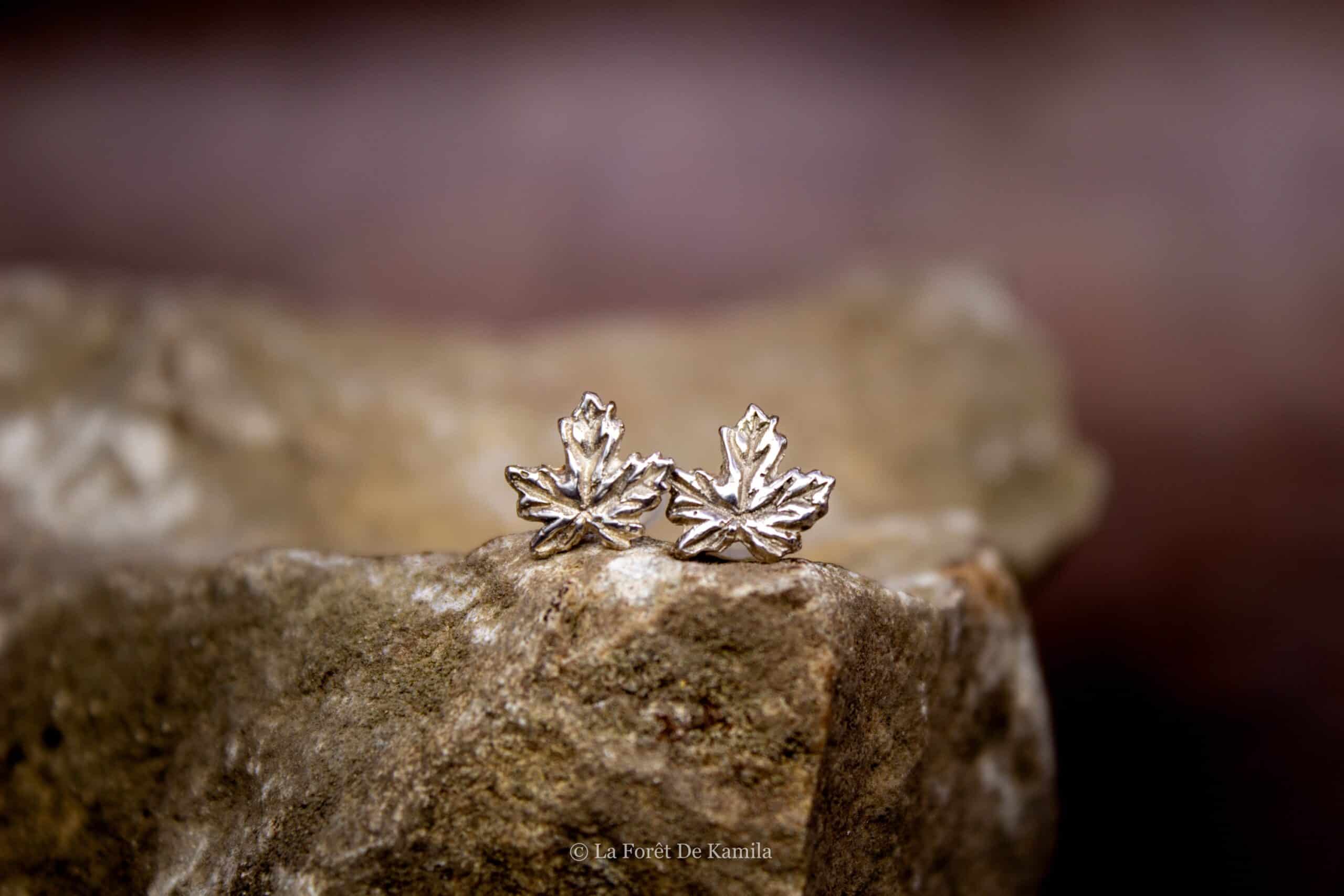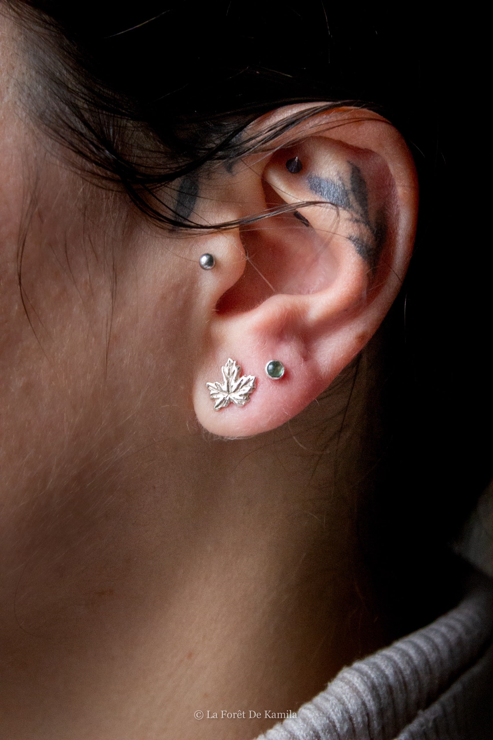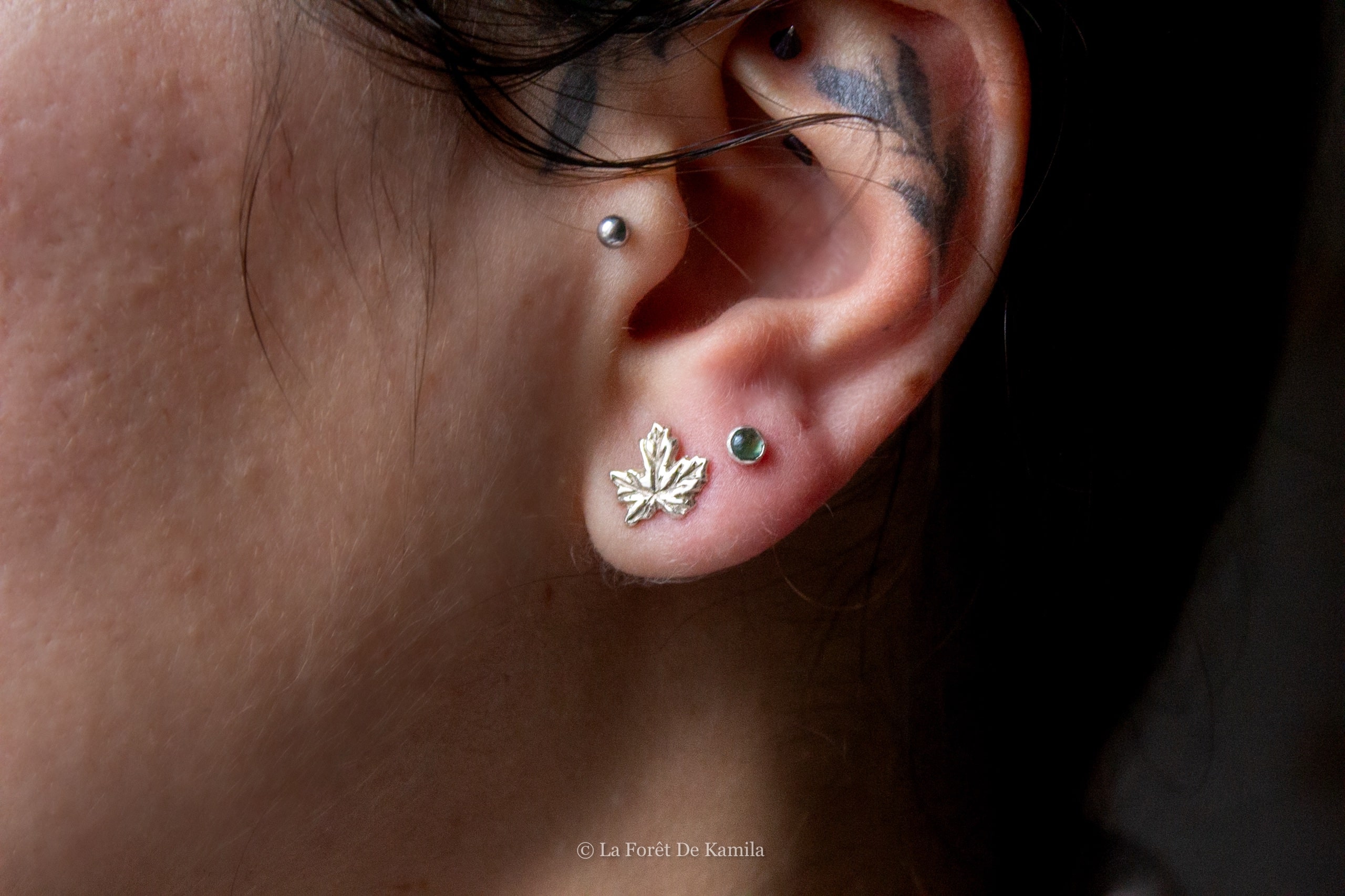 Façonné et gravé à la main, ce clou d’oreille en argent massif 950 représente une feuille d’érable, symbole d’équilibre et de passage des saisons.