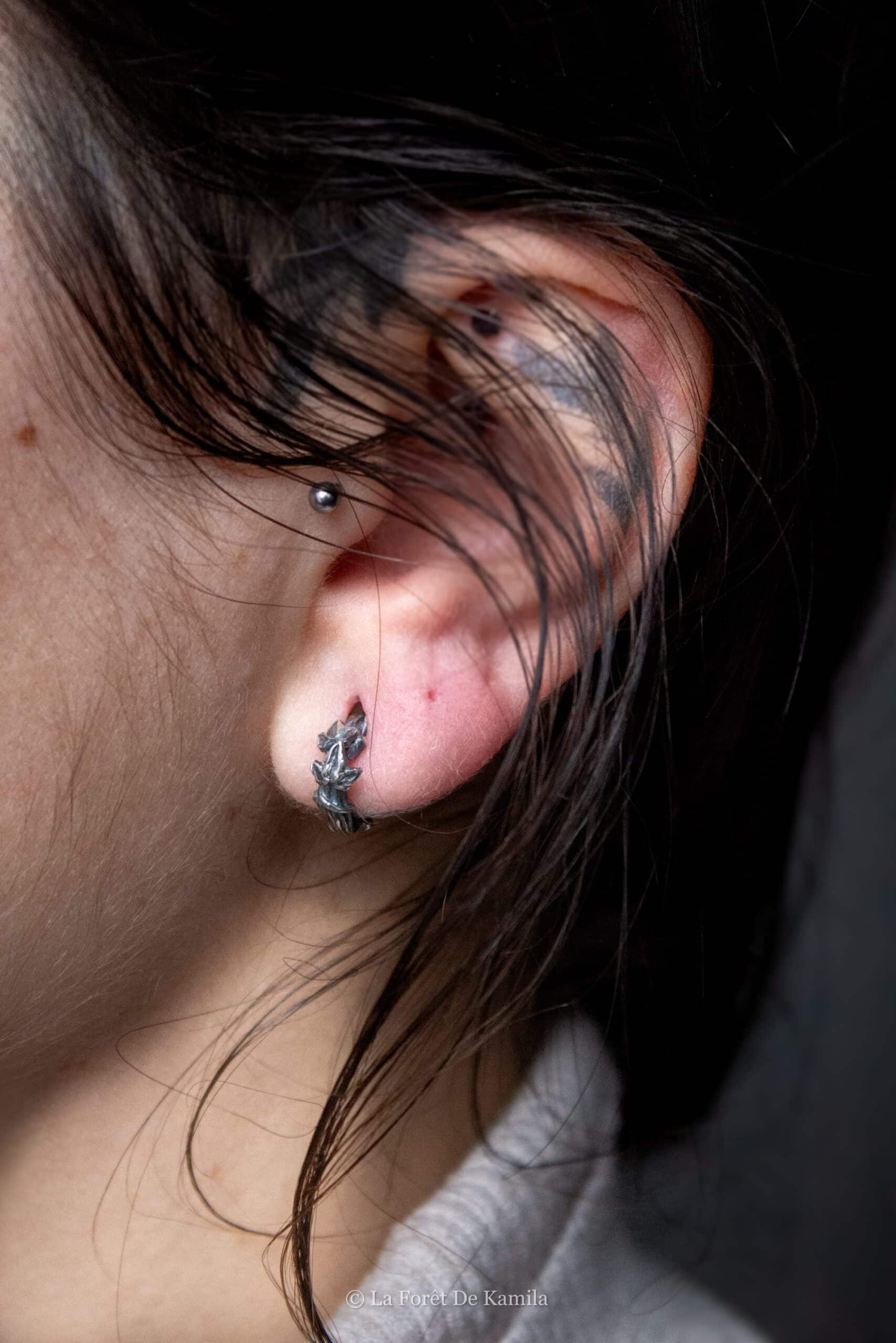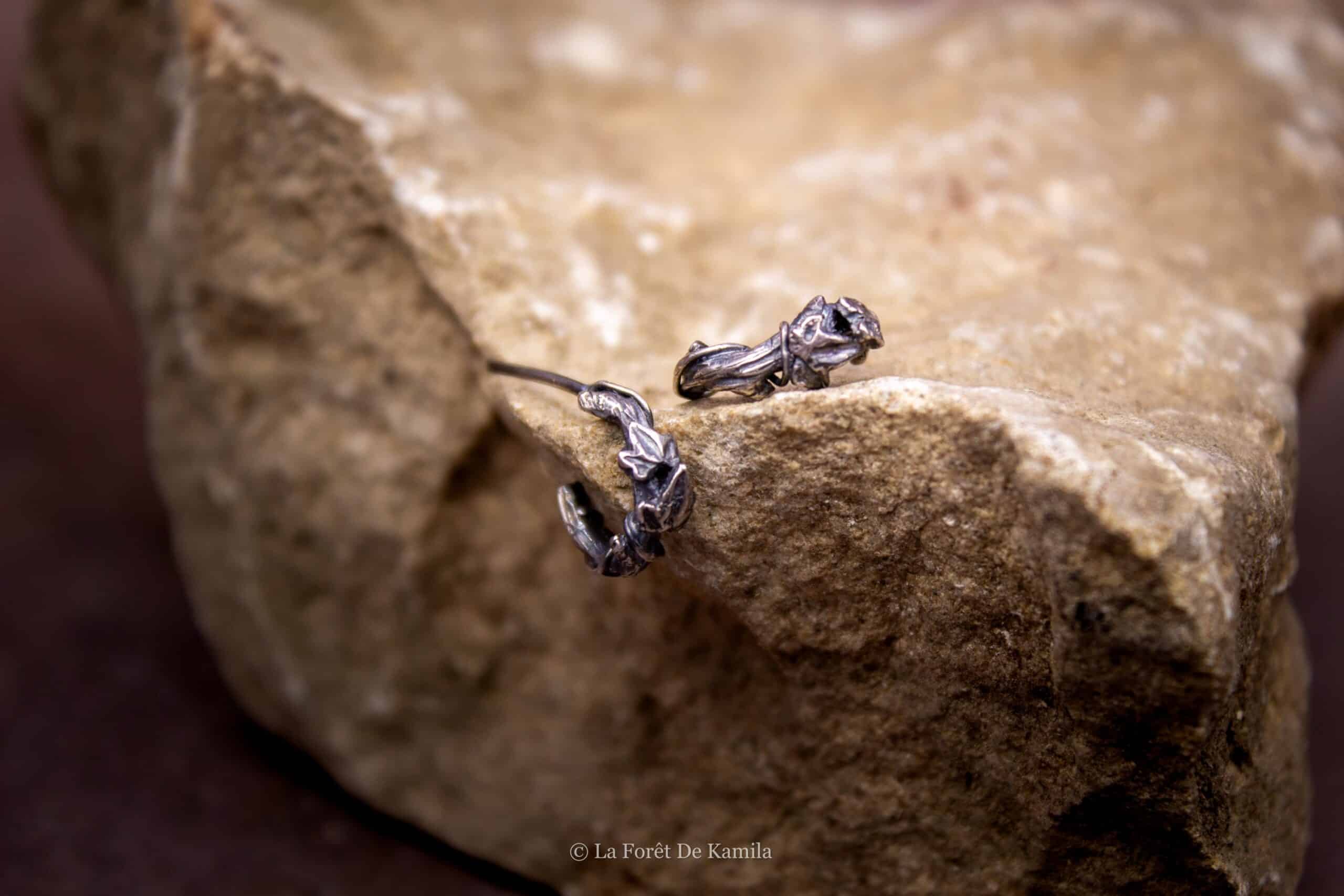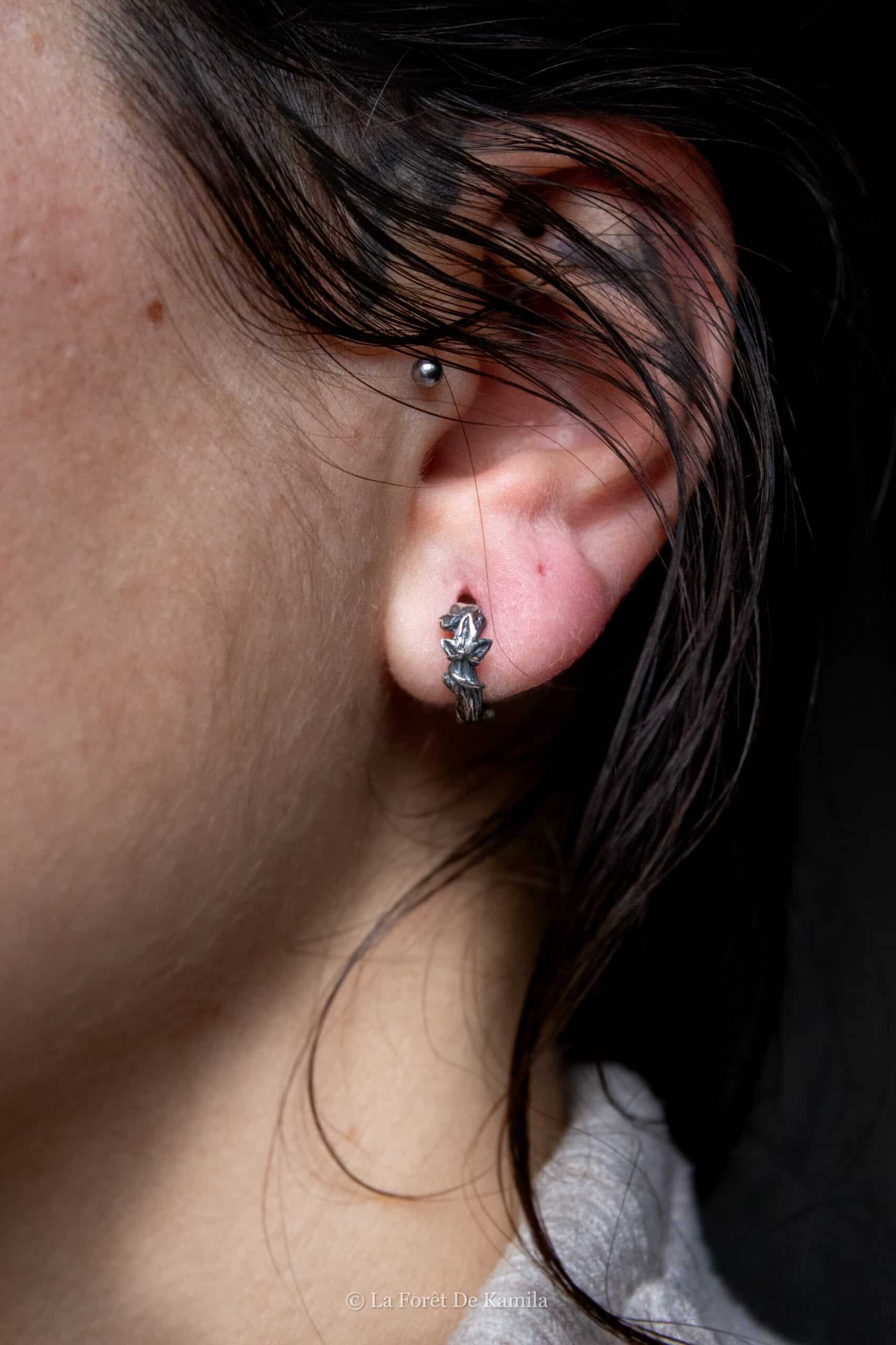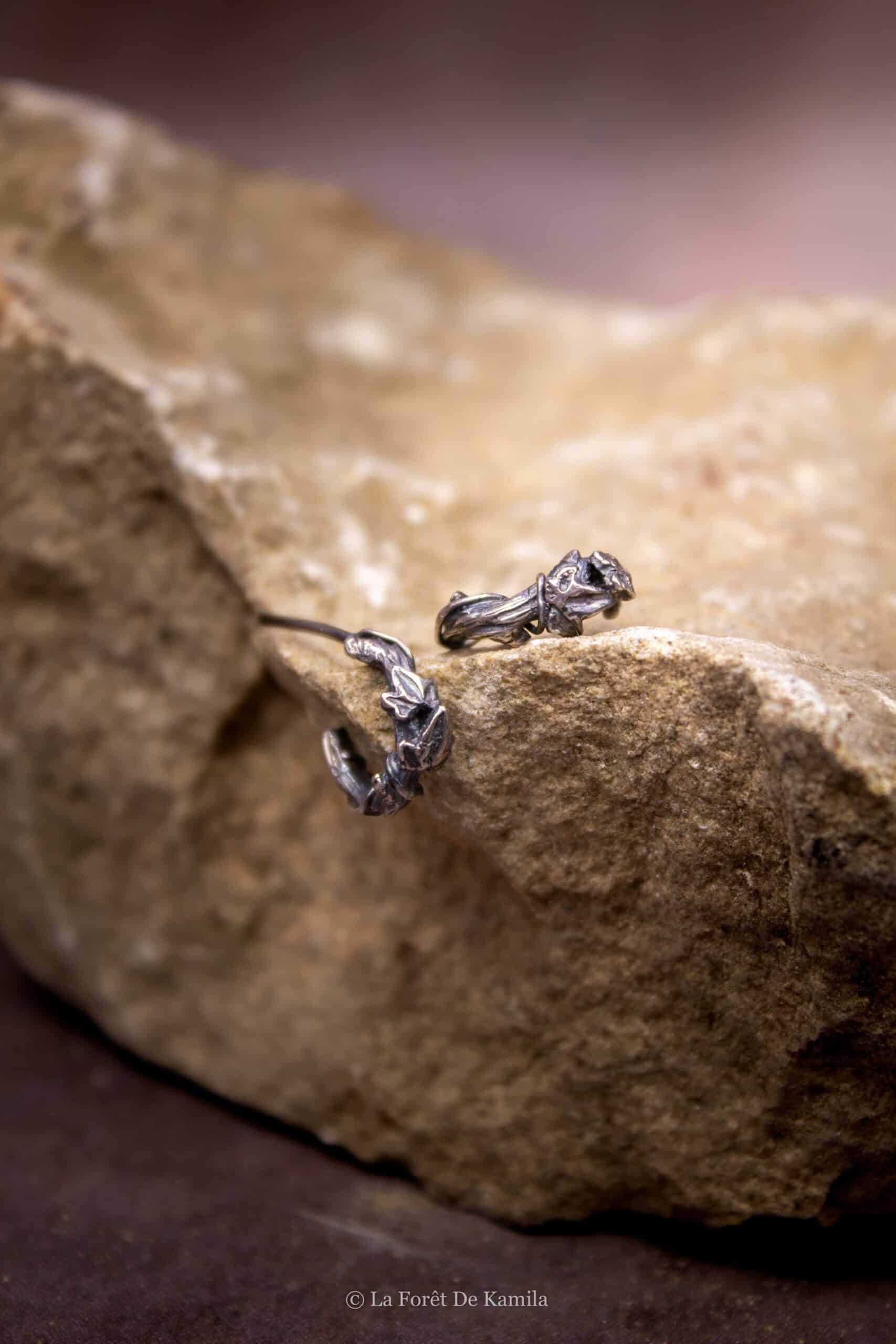 Boucles d’oreilles anneaux en argent massif 950, représentant une branche entourée de feuilles de lierre, faites main.