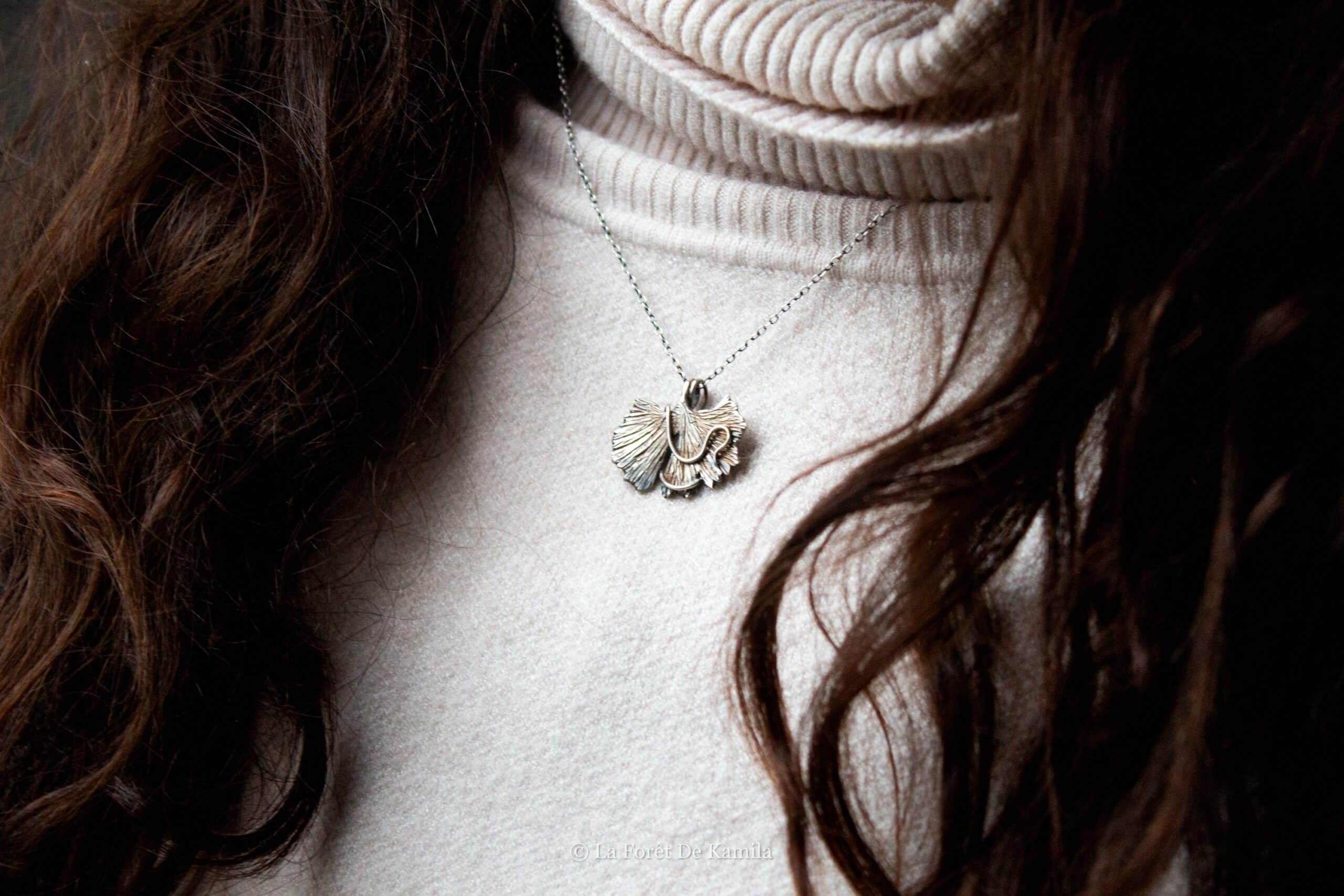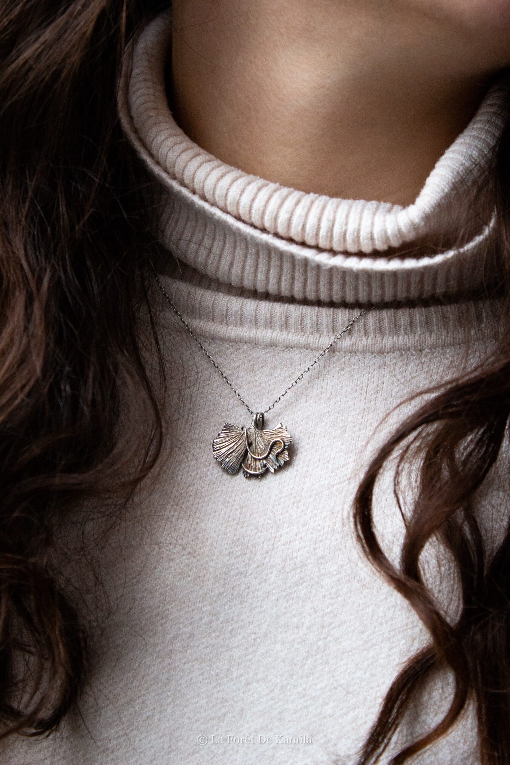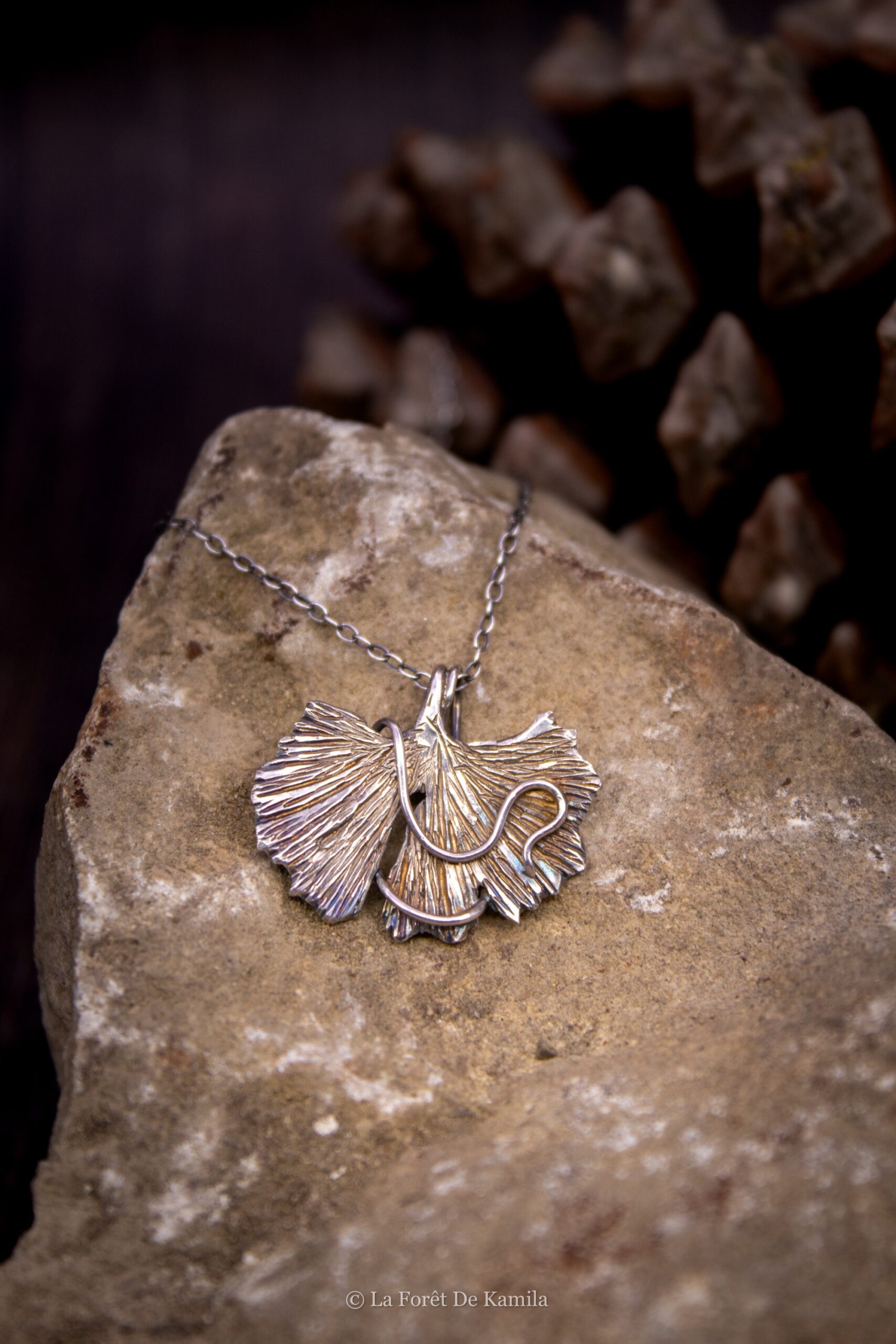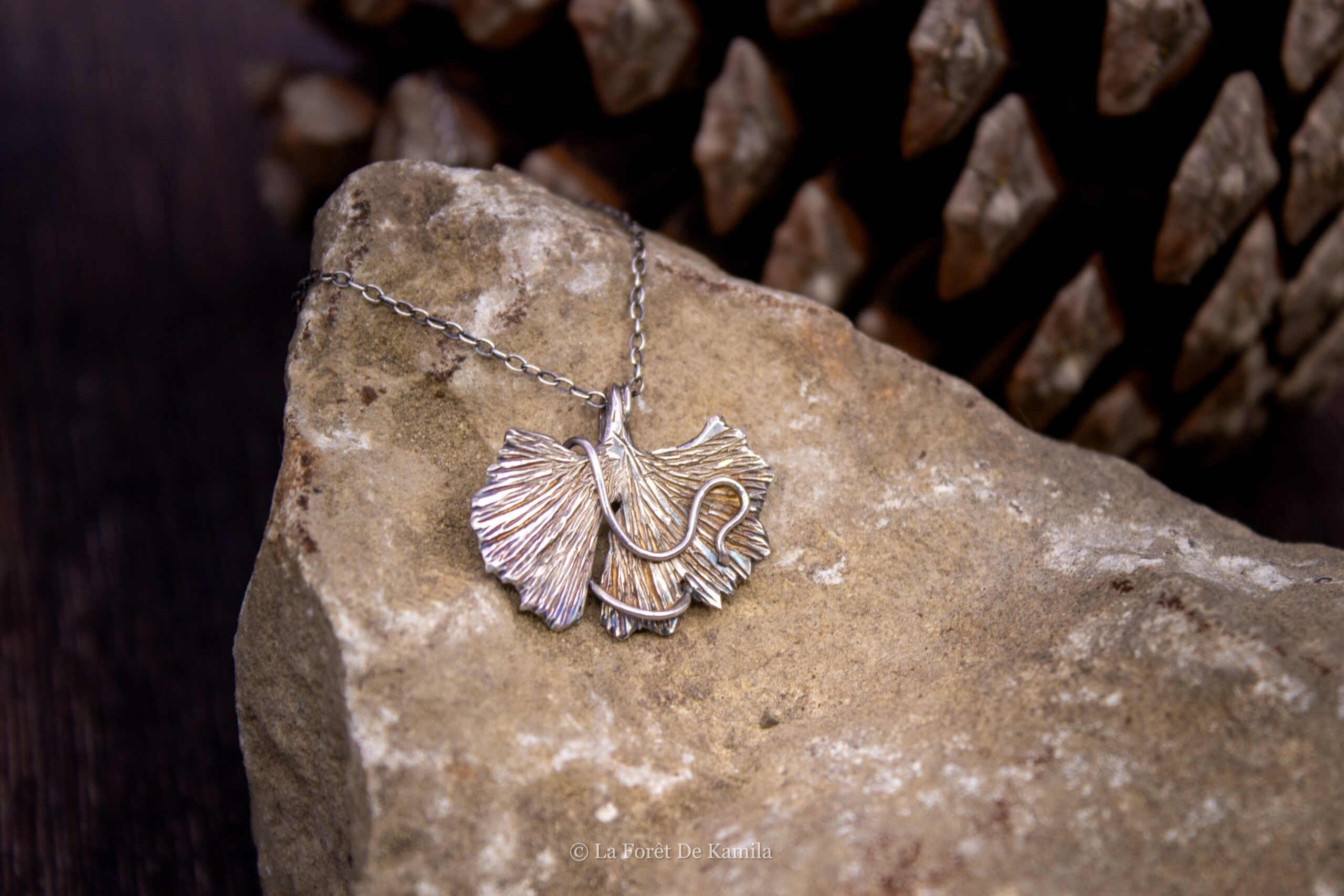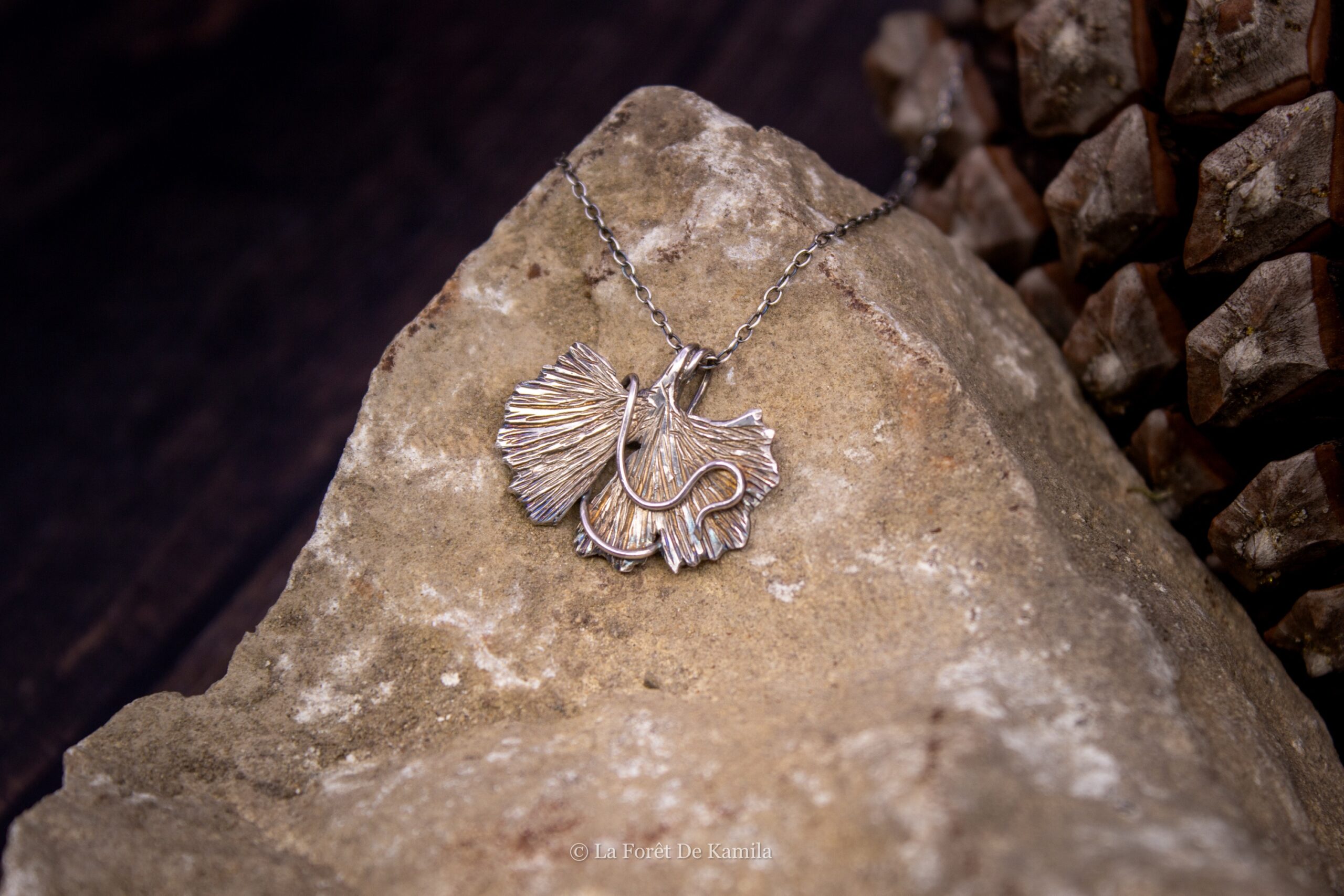 J’ai dessiné et gravé cette feuille de ginkgo biloba à la main dans l’argent massif 950. Ses éventails gracieux m’évoquent la résilience et la sagesse, puisqu’il s’agit d’un arbre ancien, symbole de longévité et de mémoire. L’entrelacs qui l’encadre apporte une touche elfique, comme un souffle venu d’un autre temps.