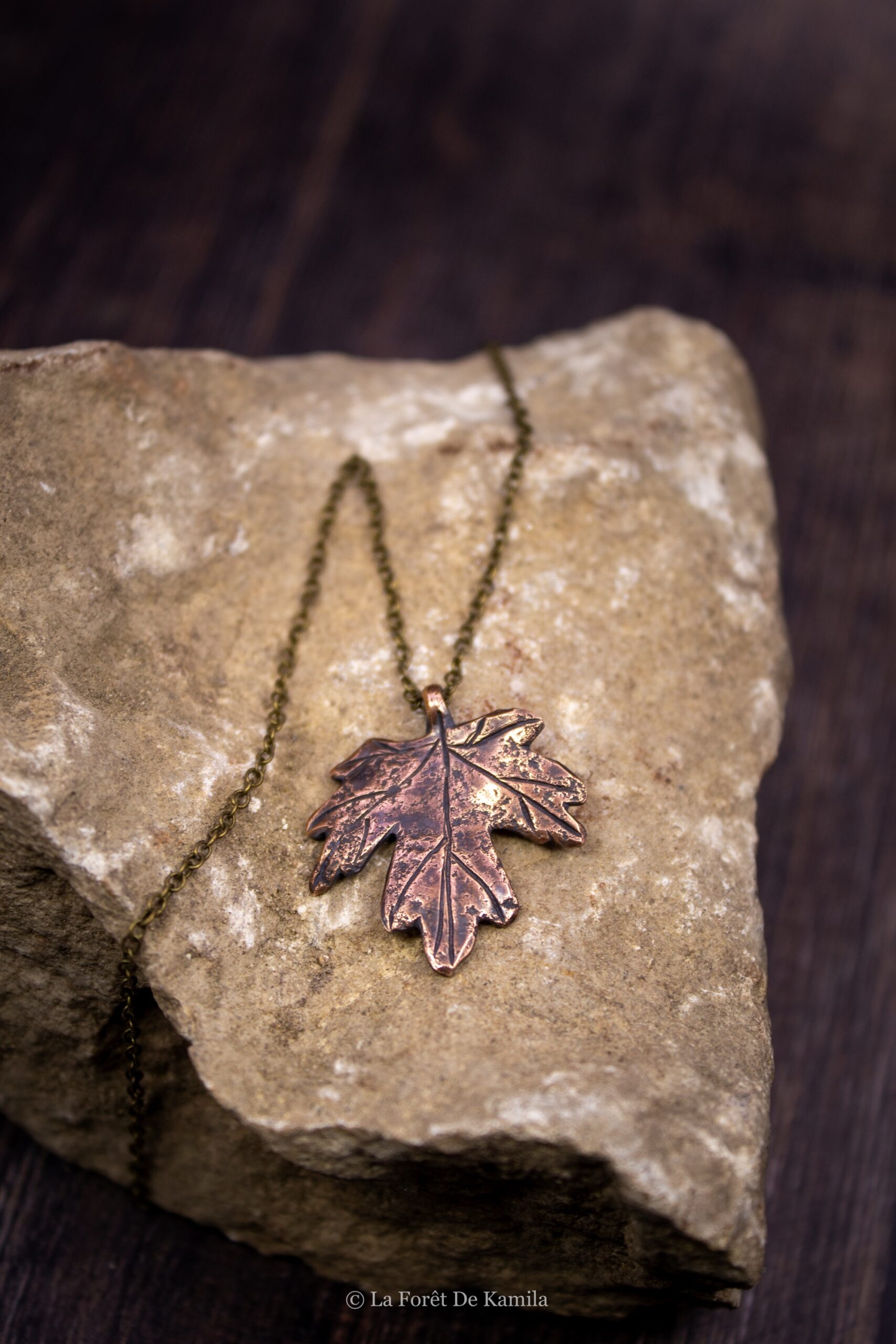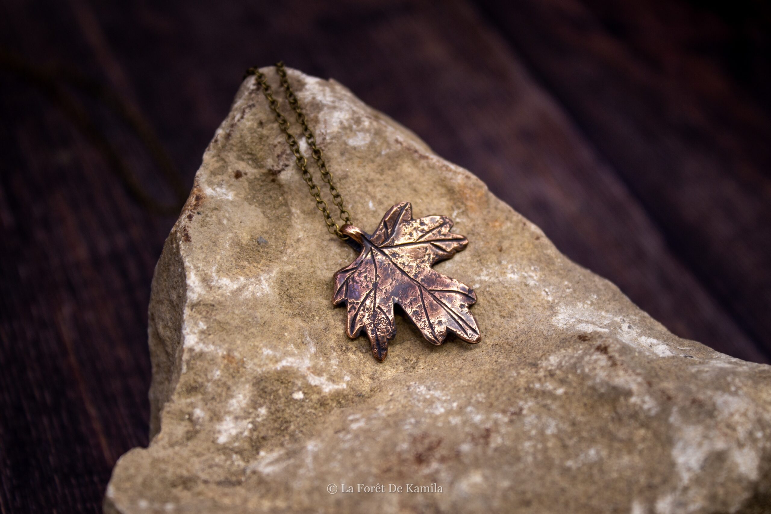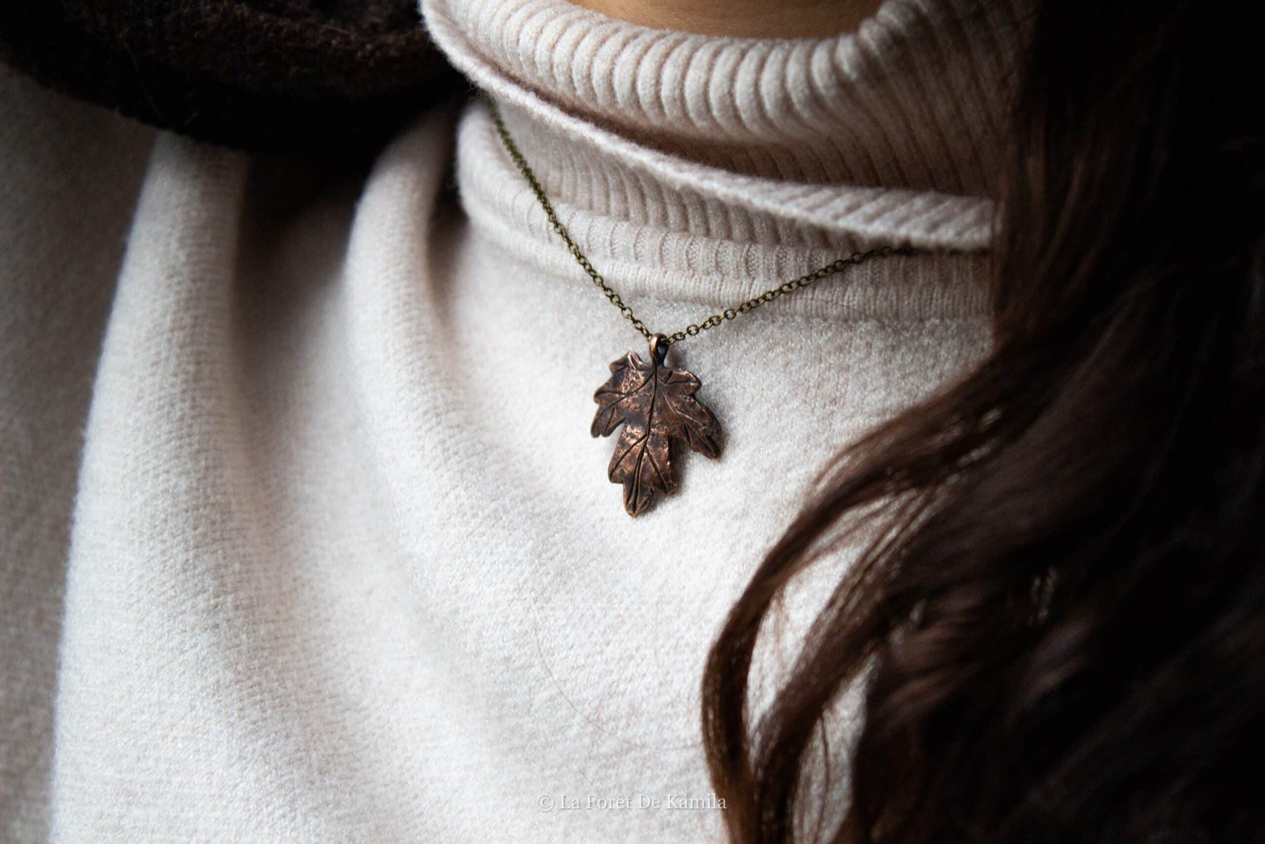 Feuille d’érable champêtre gravée à la main dans le bronze massif, finition oxydée et polie. Chaîne en laiton (45 cm).