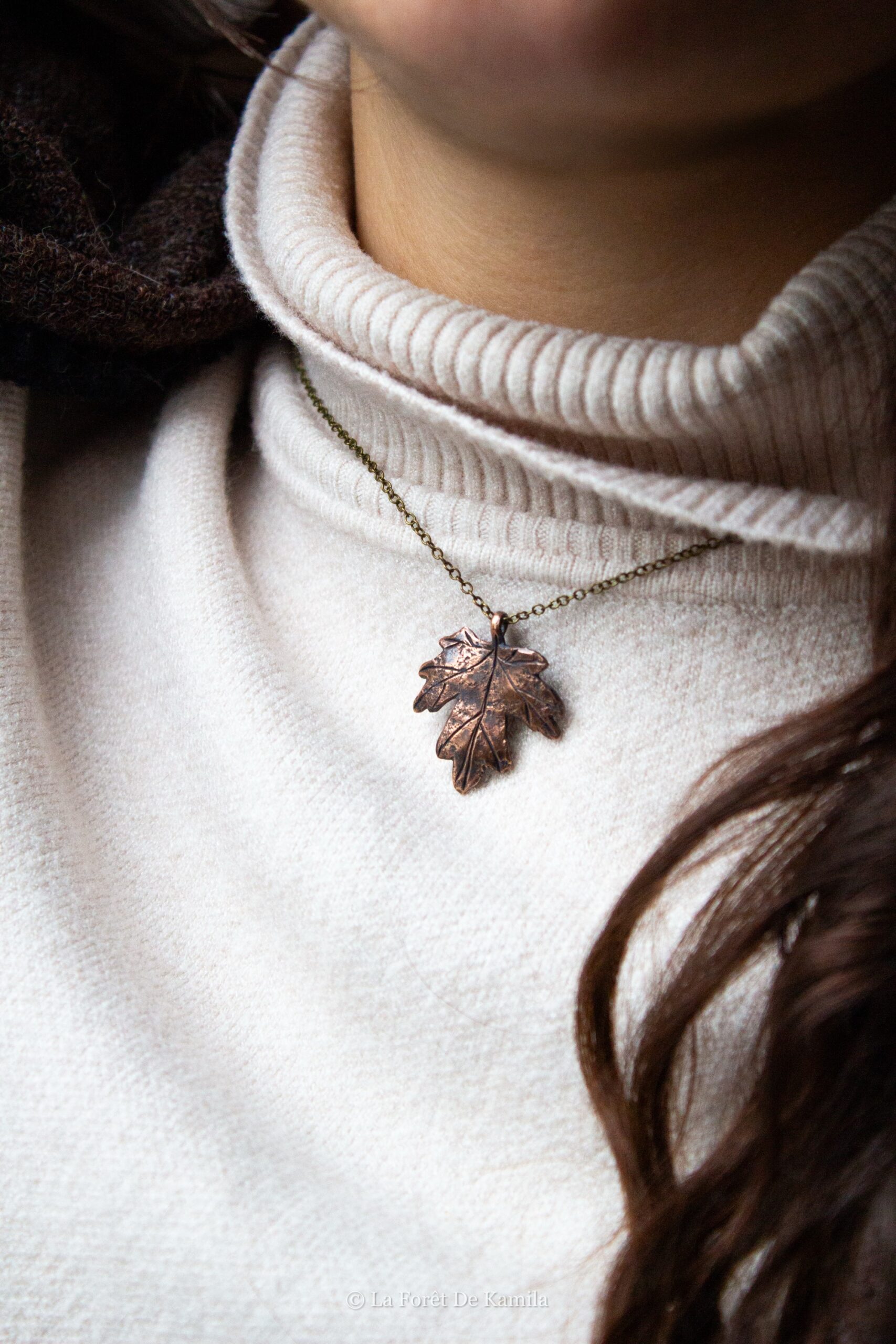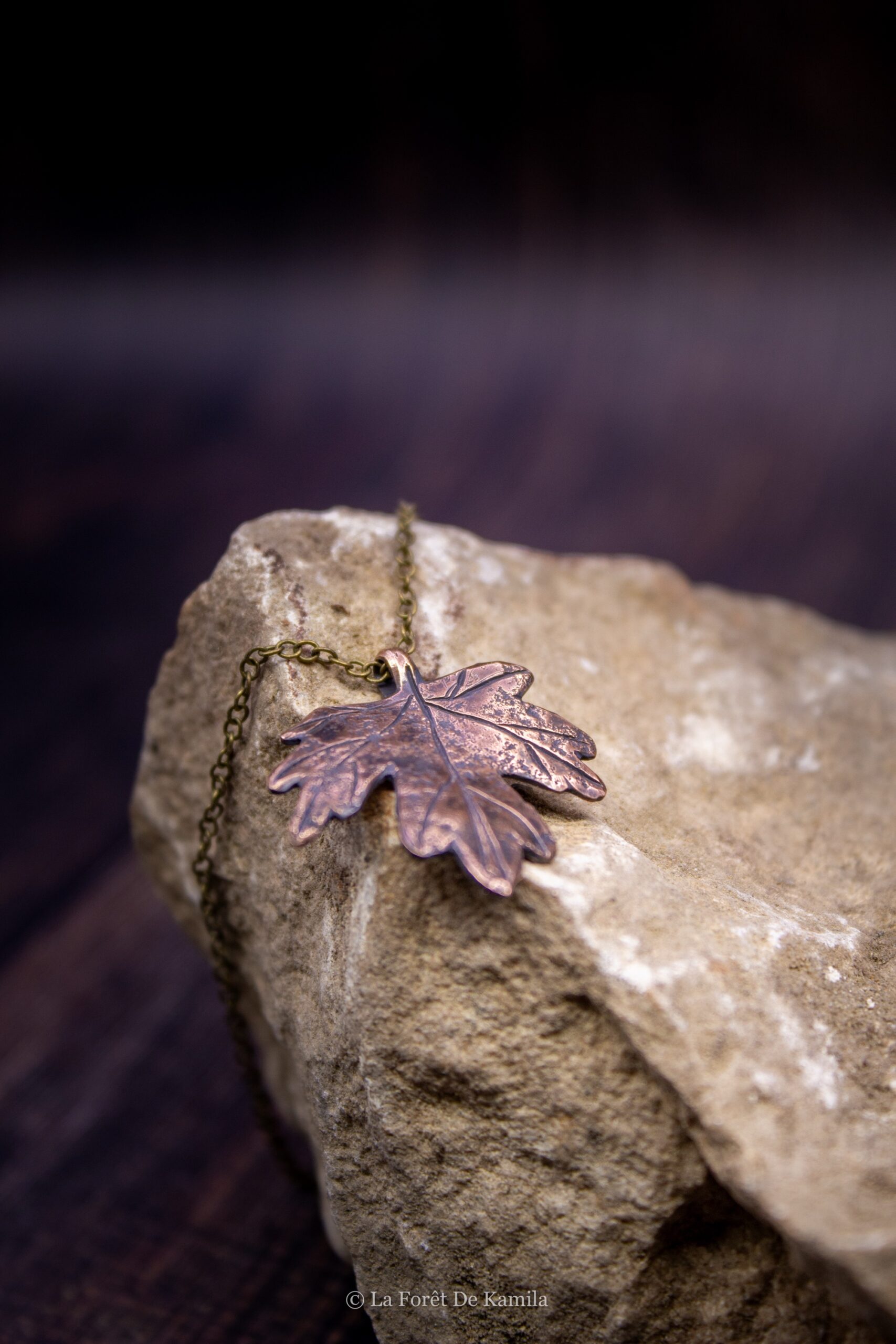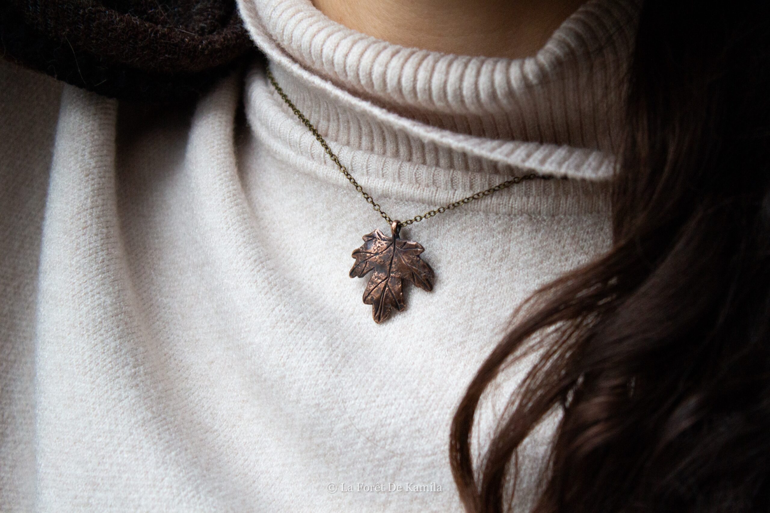 Feuille d’érable champêtre gravée à la main dans le bronze massif, finition oxydée et polie. Chaîne en laiton (45 cm).