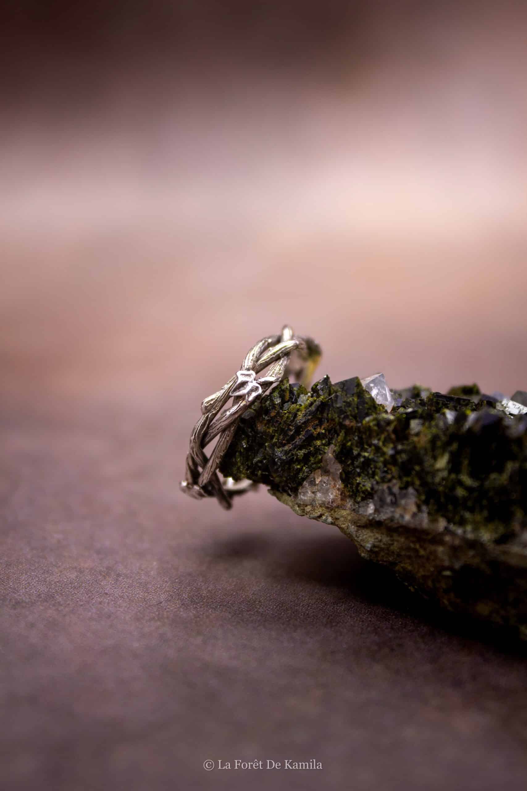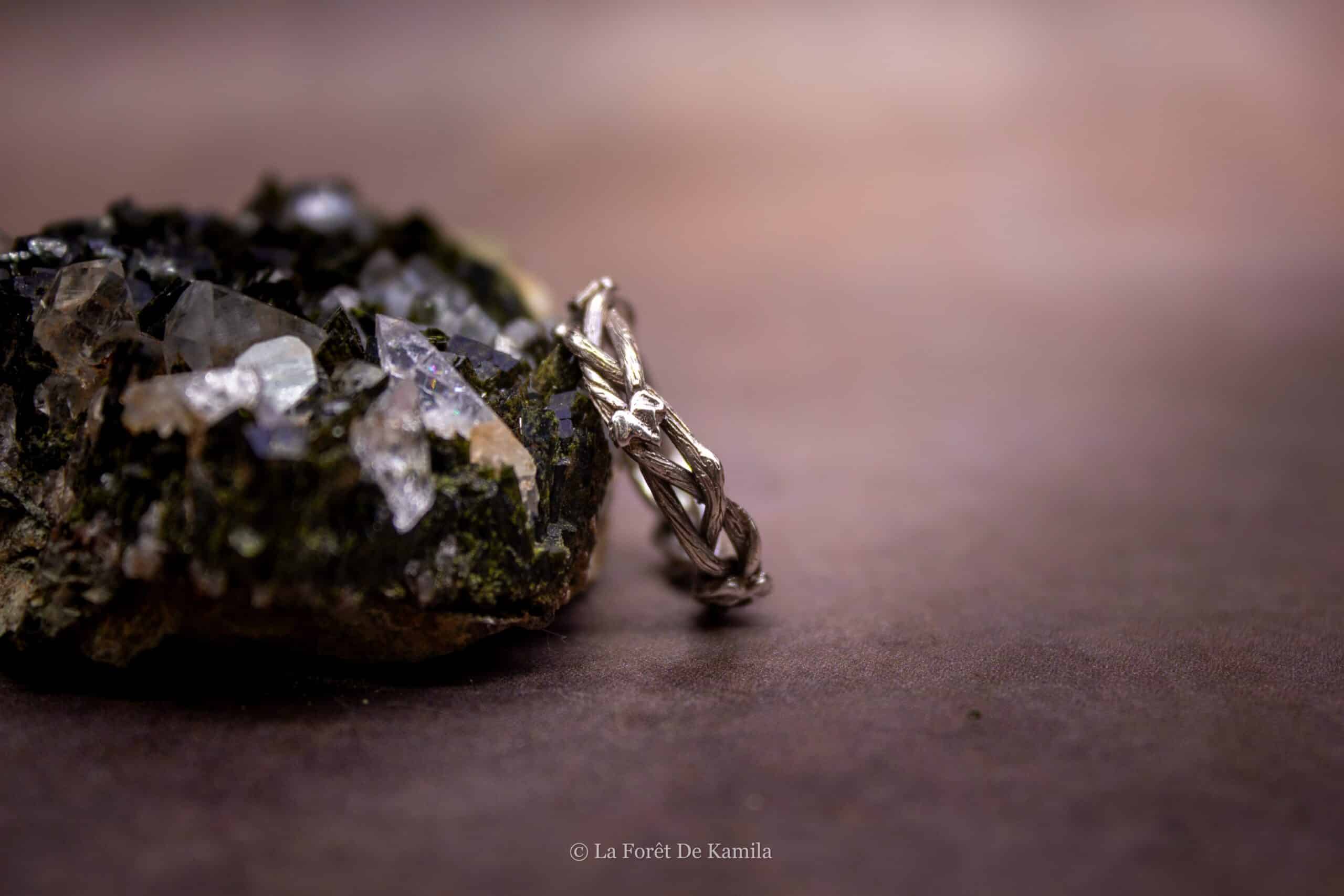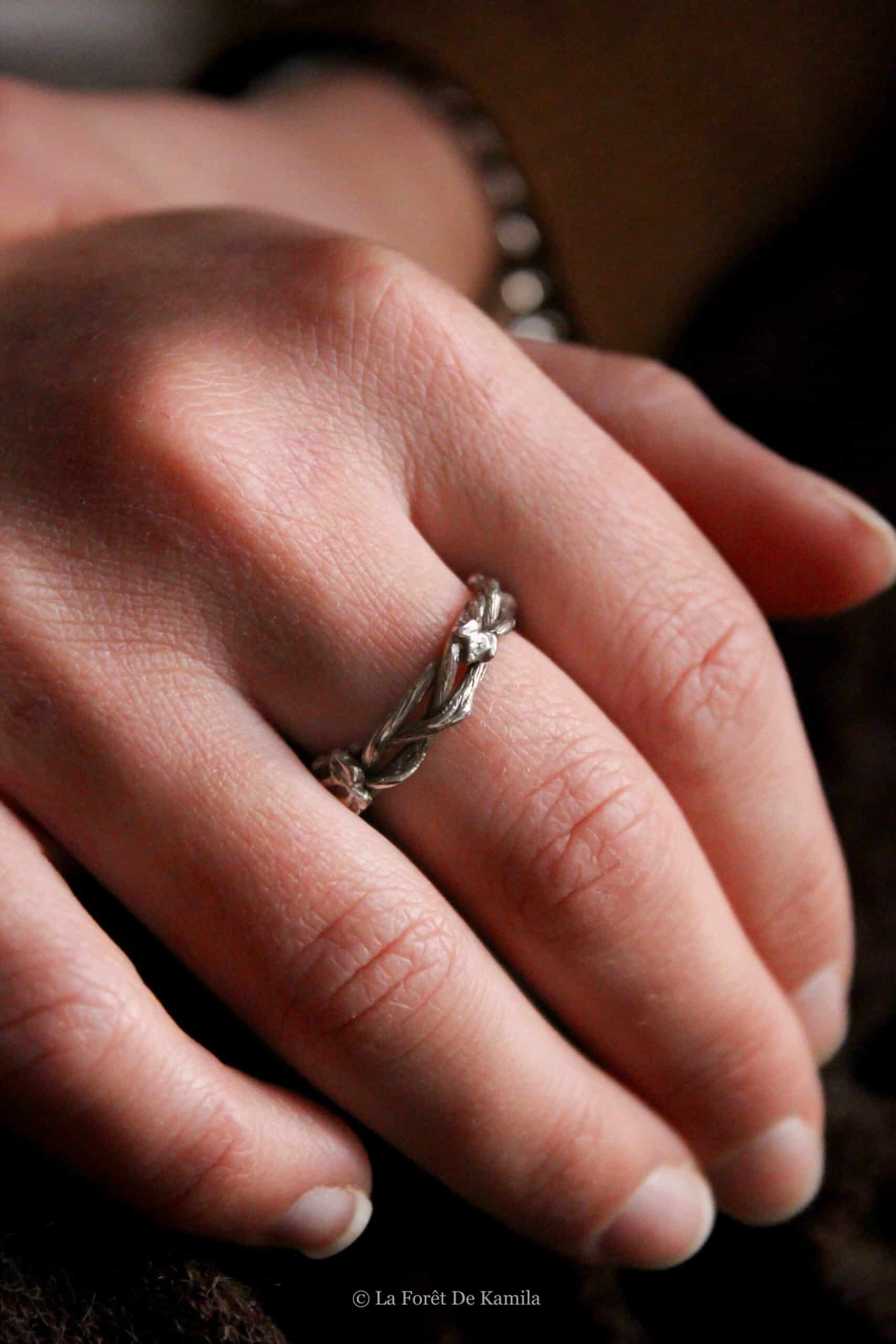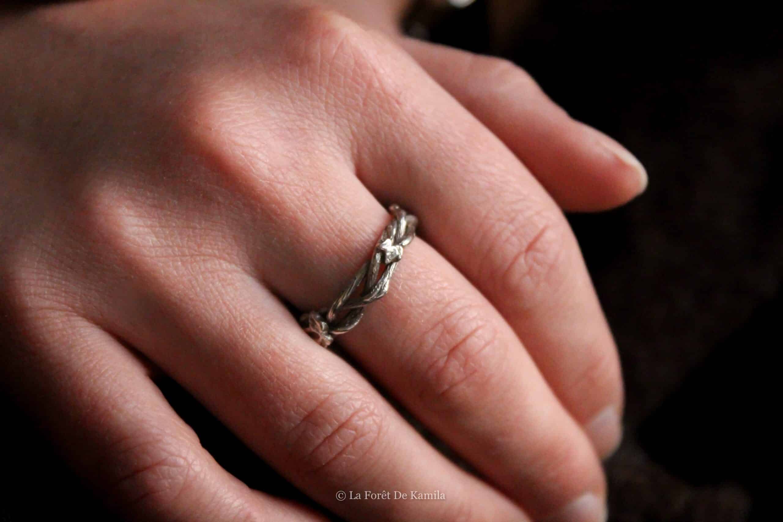 Bague elfique forgée à la main en argent massif 950, tressée comme une branche et ornée de feuilles de lierre gravées.