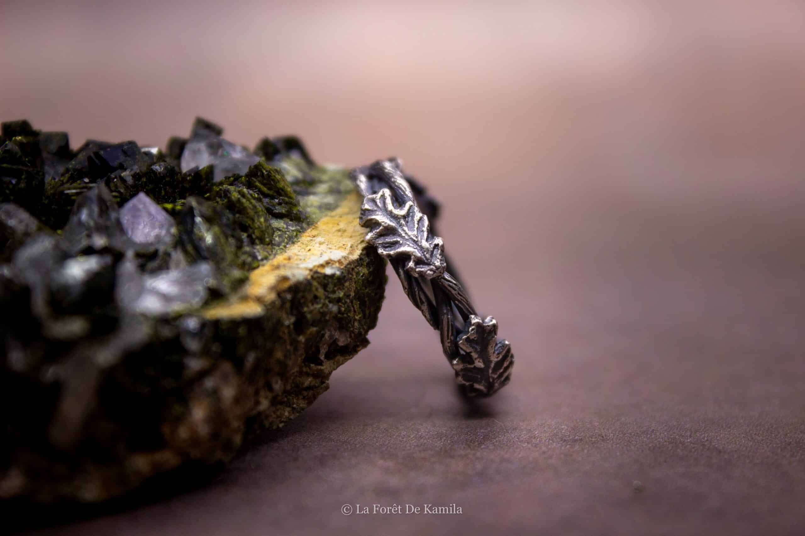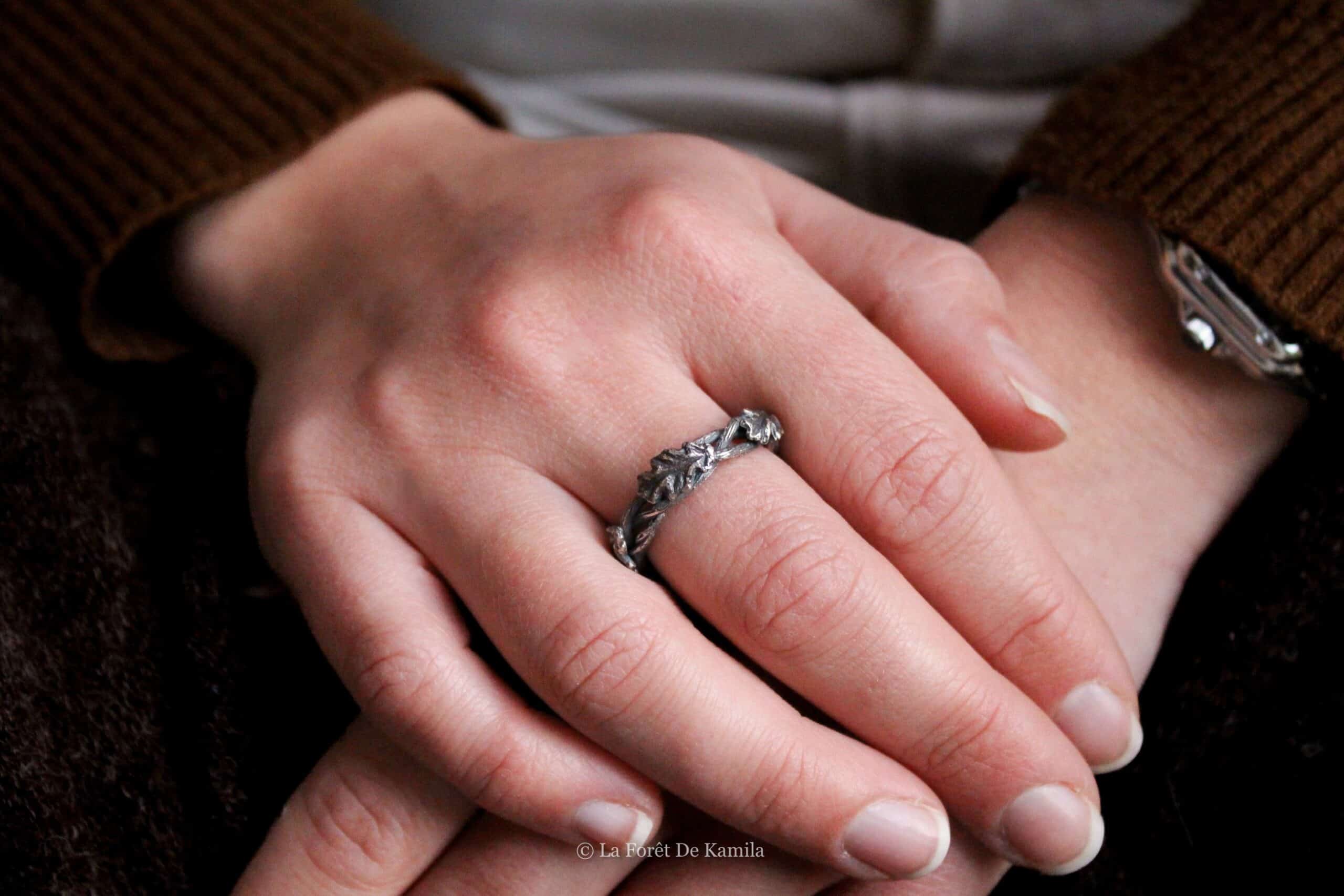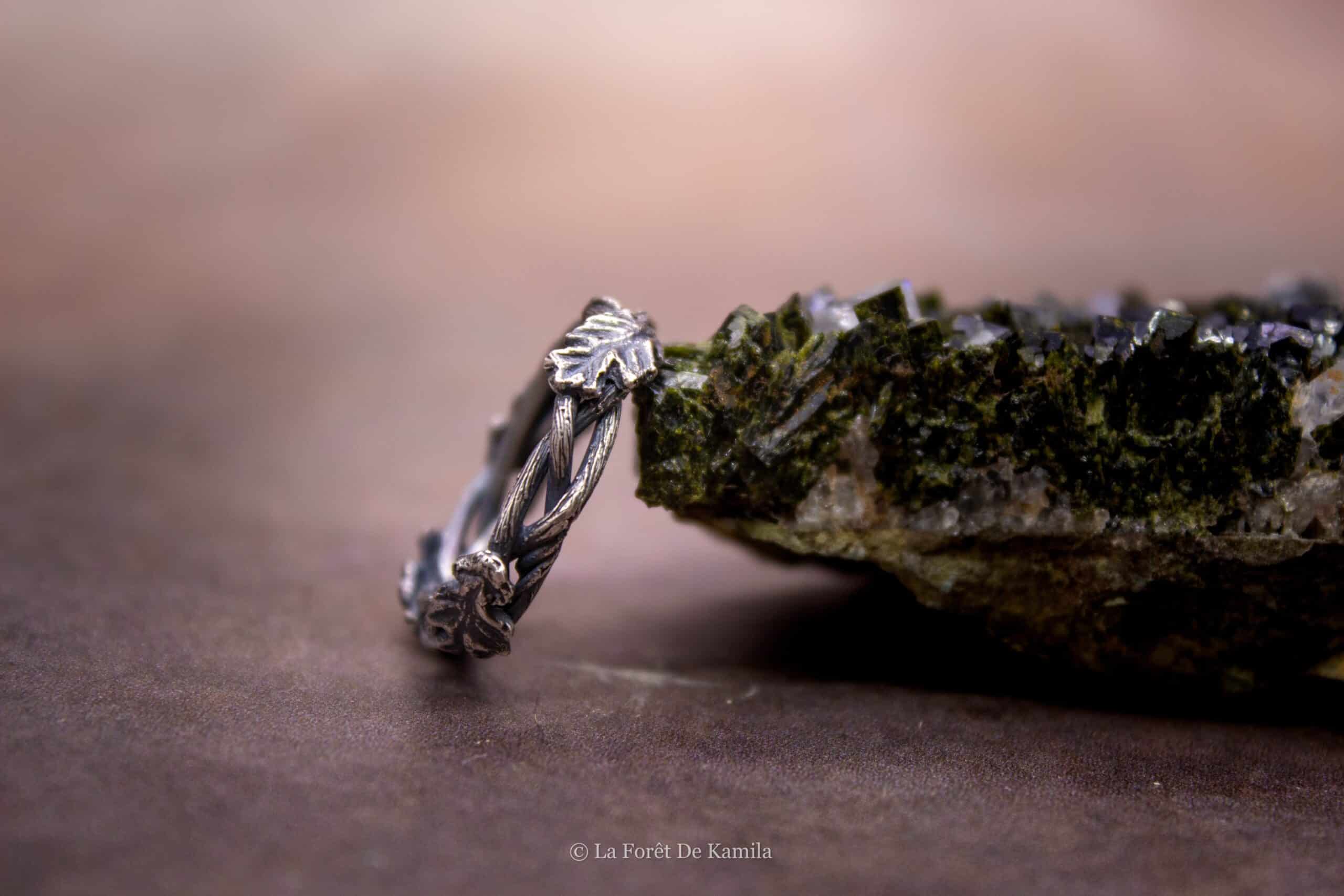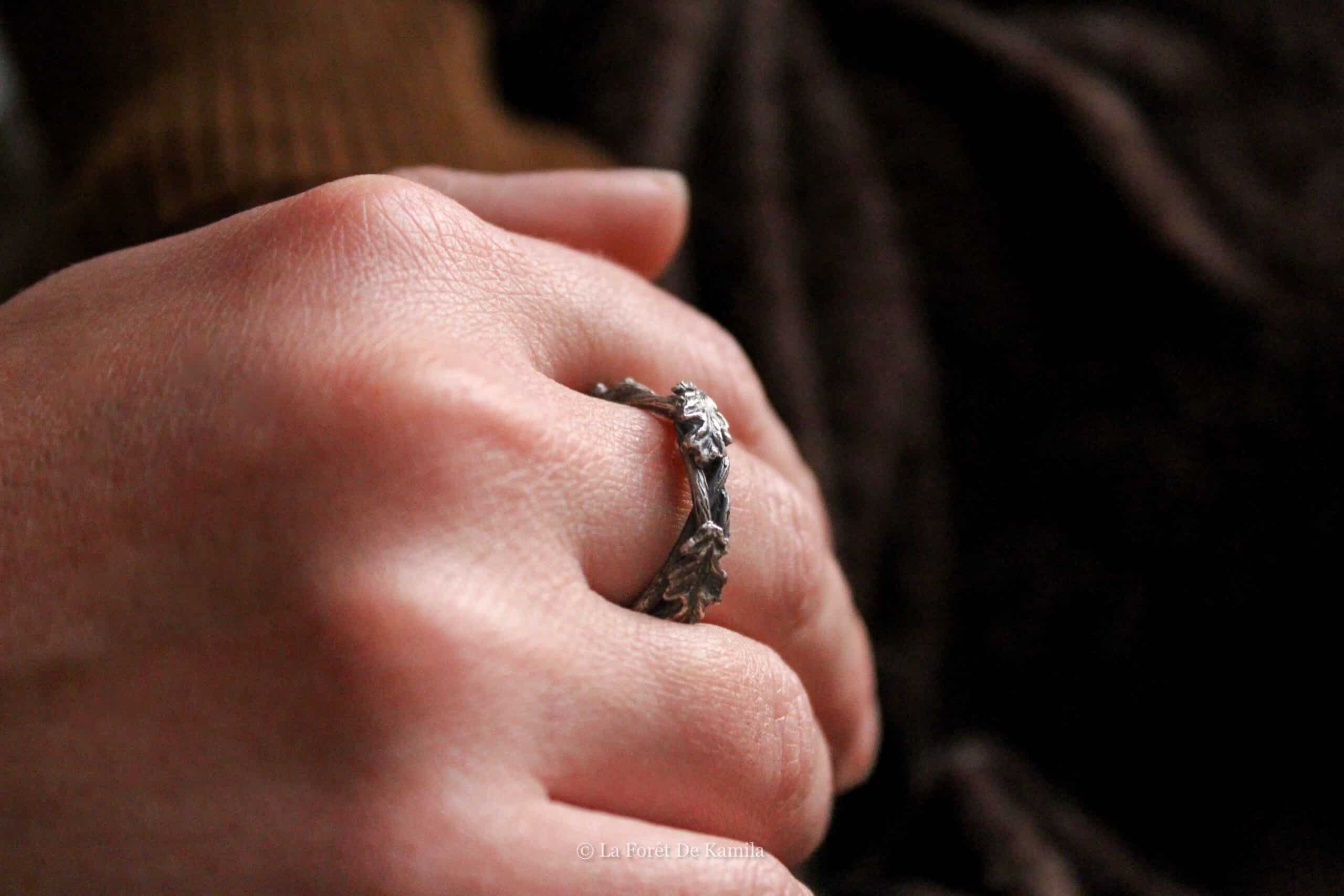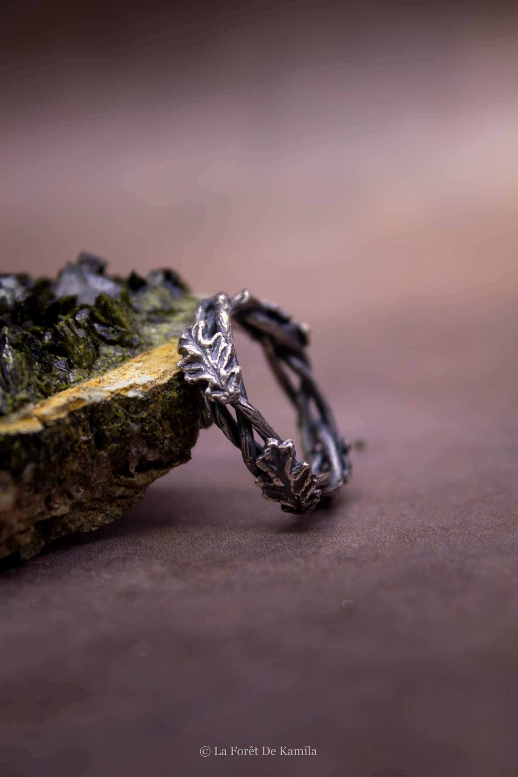 Bague elfique forgée à la main en argent massif 950, tressée comme une branche et ornée de feuilles de chêne