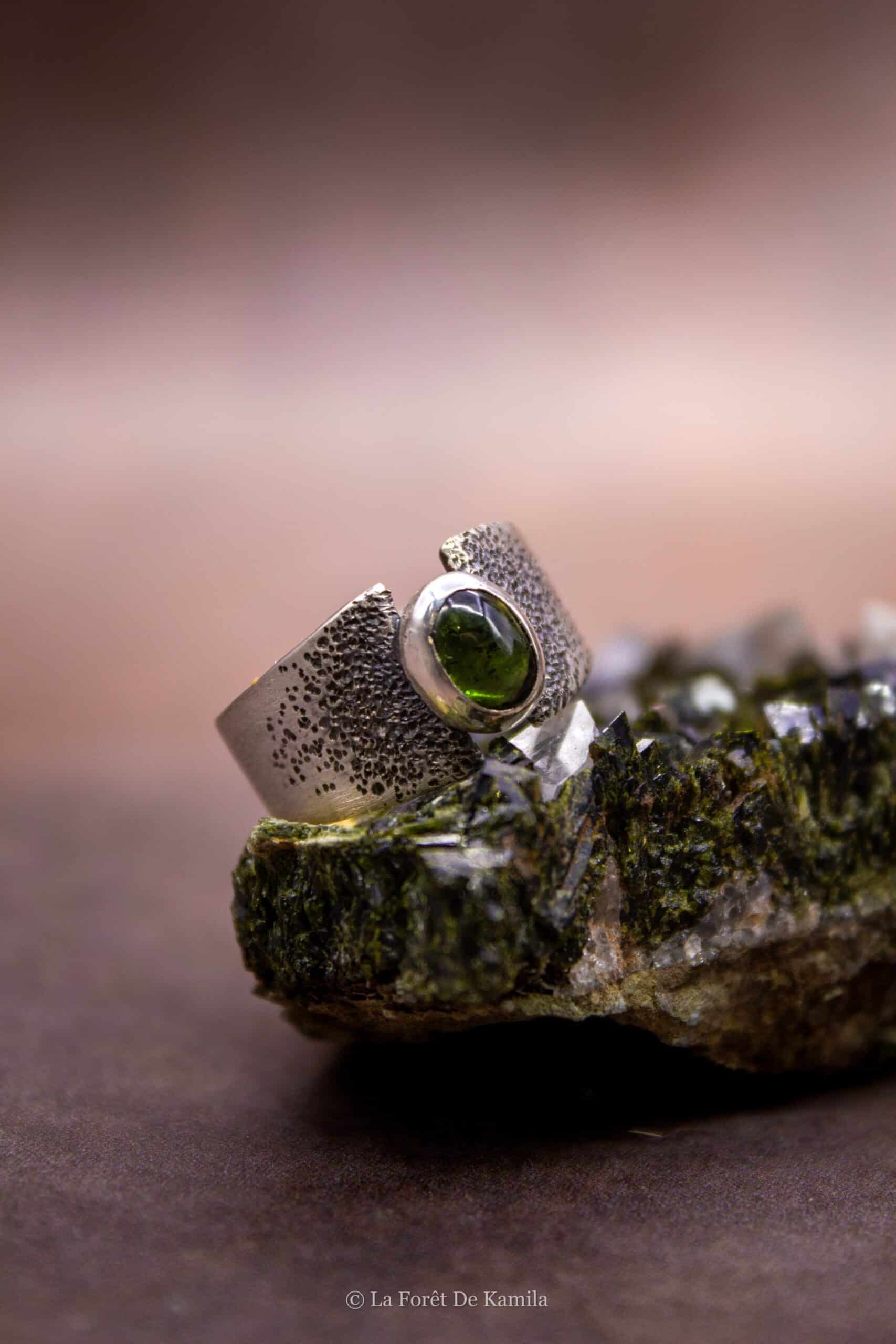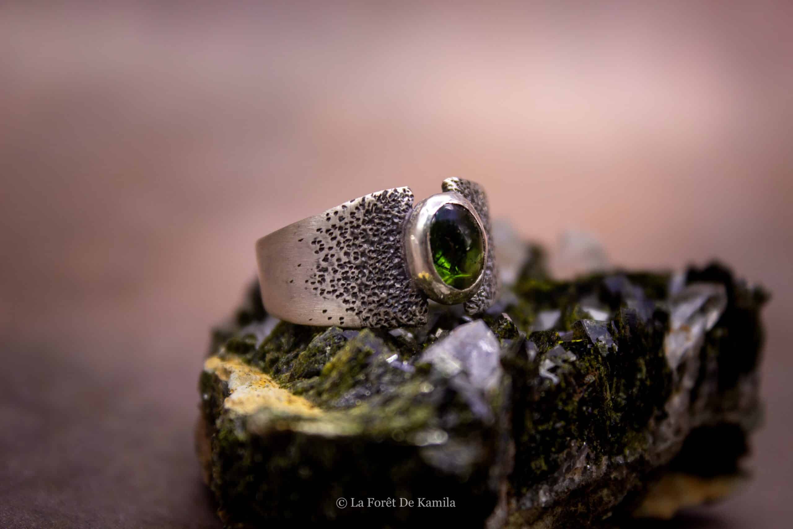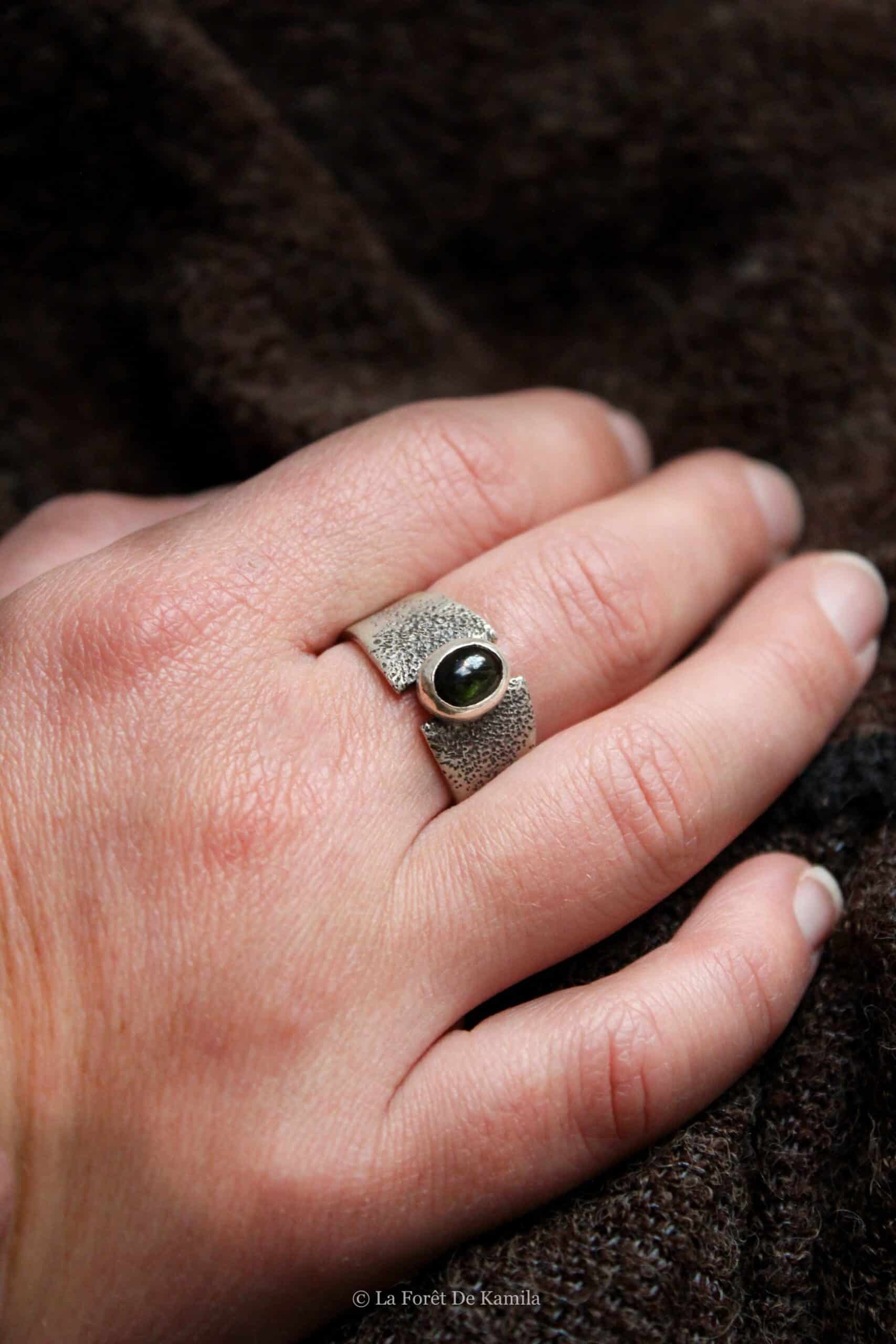 Bague en argent massif 950 sertie d’une tourmaline verte, forgée, texturée et oxydée à la main. Pièce unique.