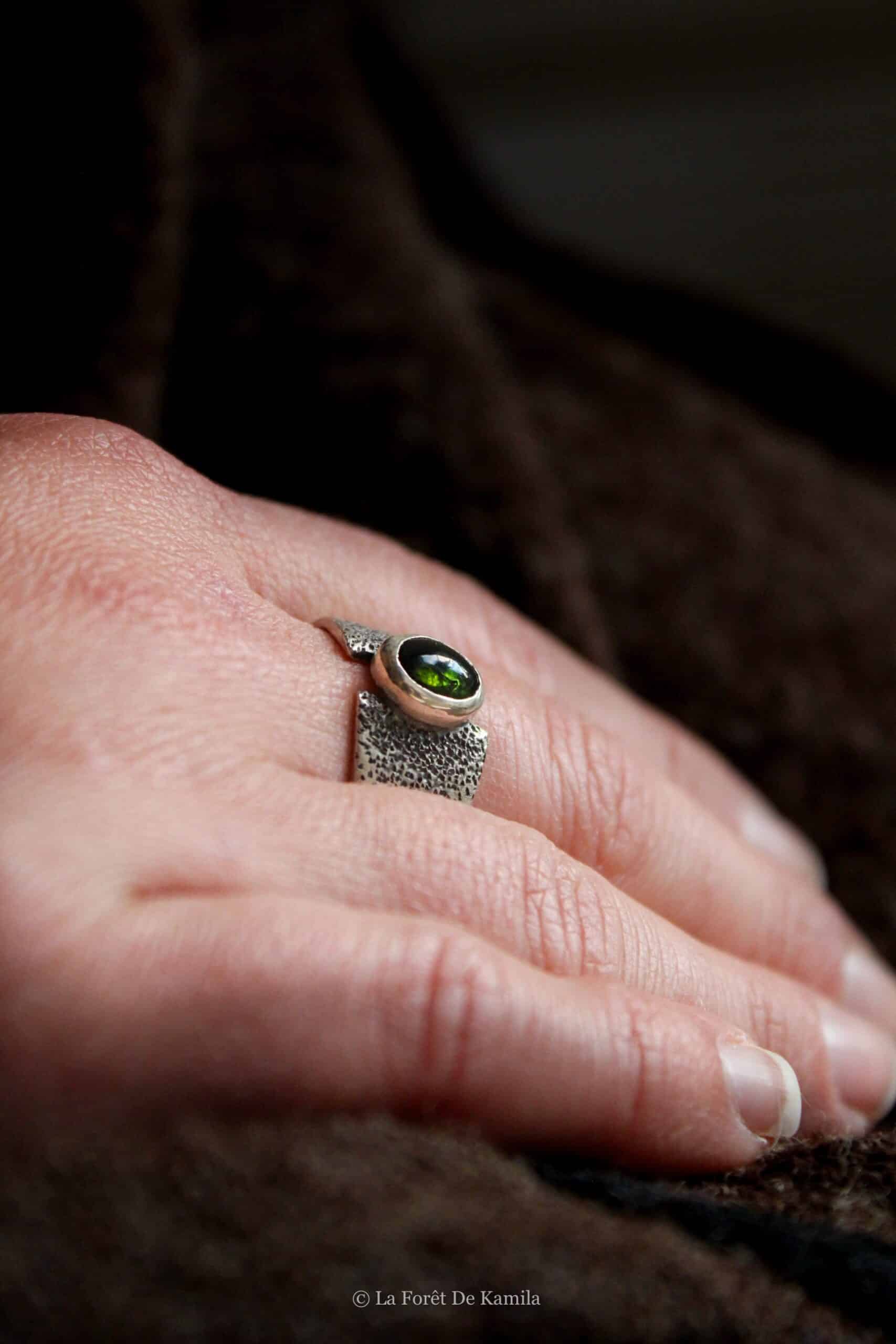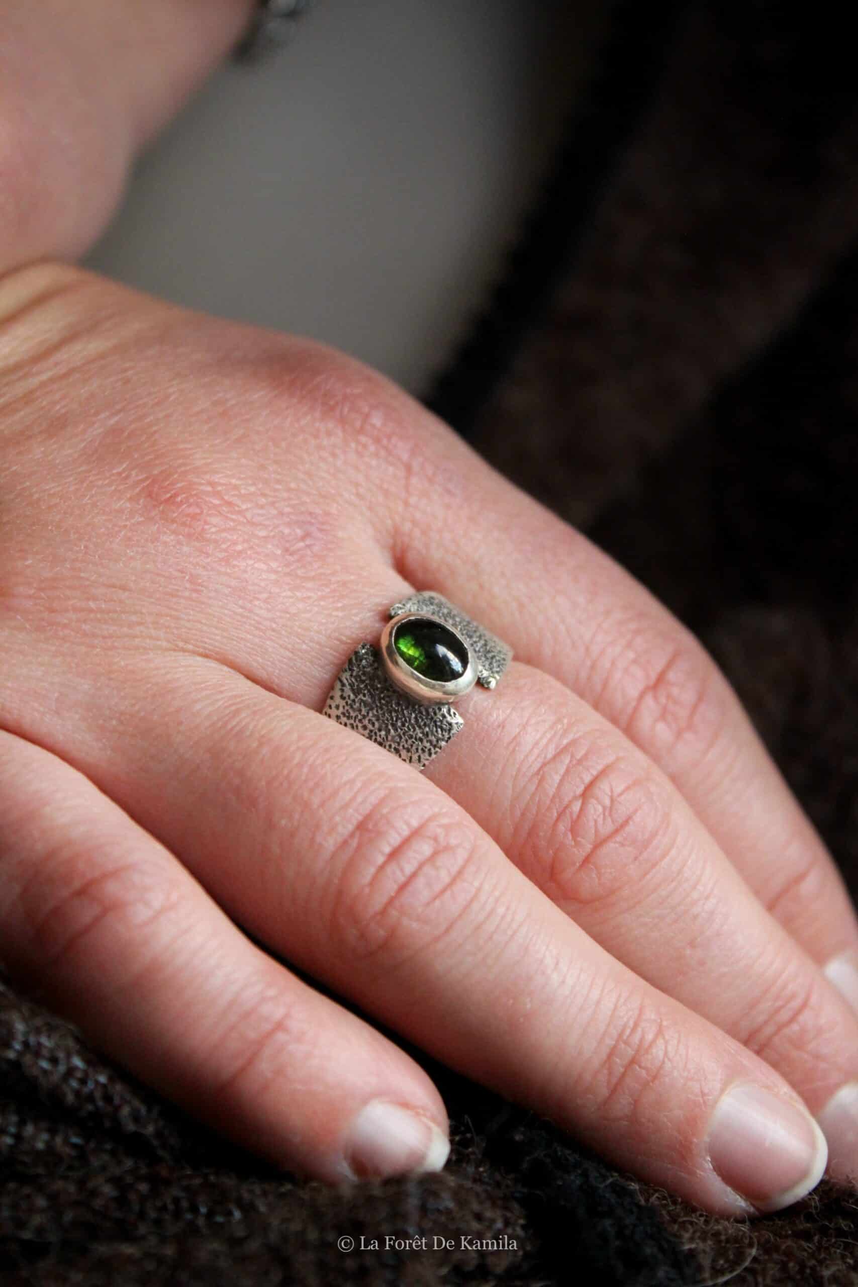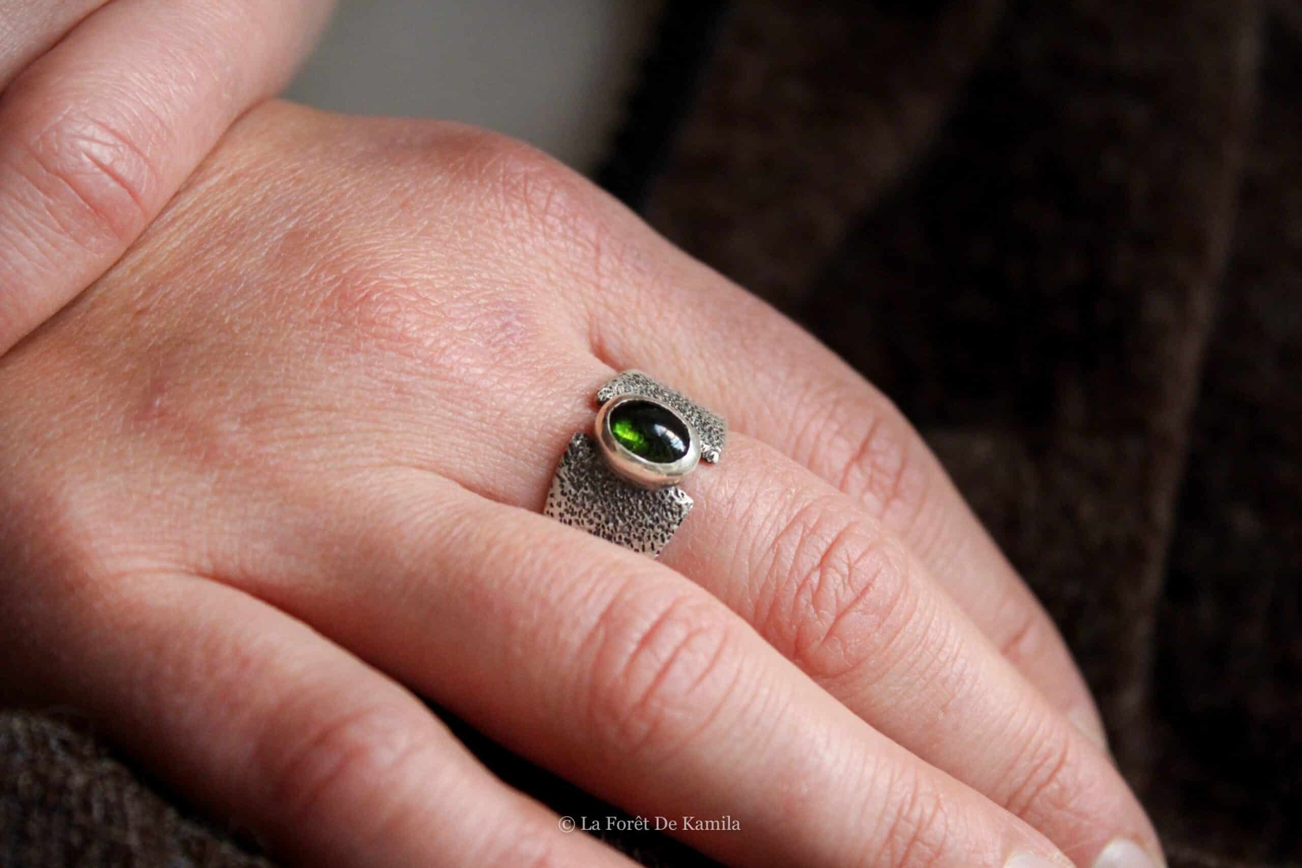 Bague en argent massif 950 sertie d’une tourmaline verte, forgée, texturée et oxydée à la main. Pièce unique.